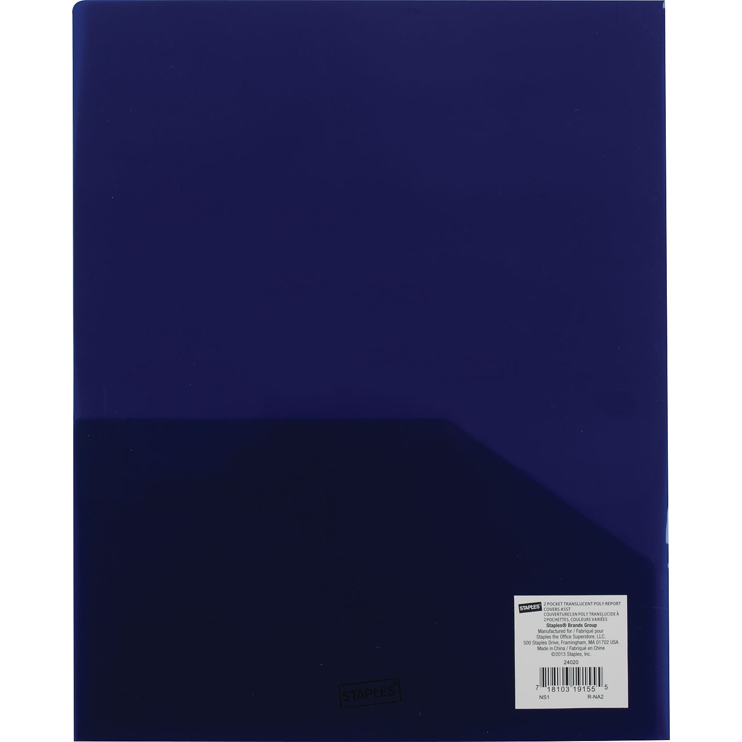 The Staples 2-pocket poly folder in navy handles all of your document needsThe Staples 2-pocket poly folder in navy is made of soft and semi-translucent poly so that contents can be easily identified. No fasteners. Convenient twin pockets hold loose documents and other materials. The Staples brand is 100% satisfaction guaranteed. Sold as 1 Each.