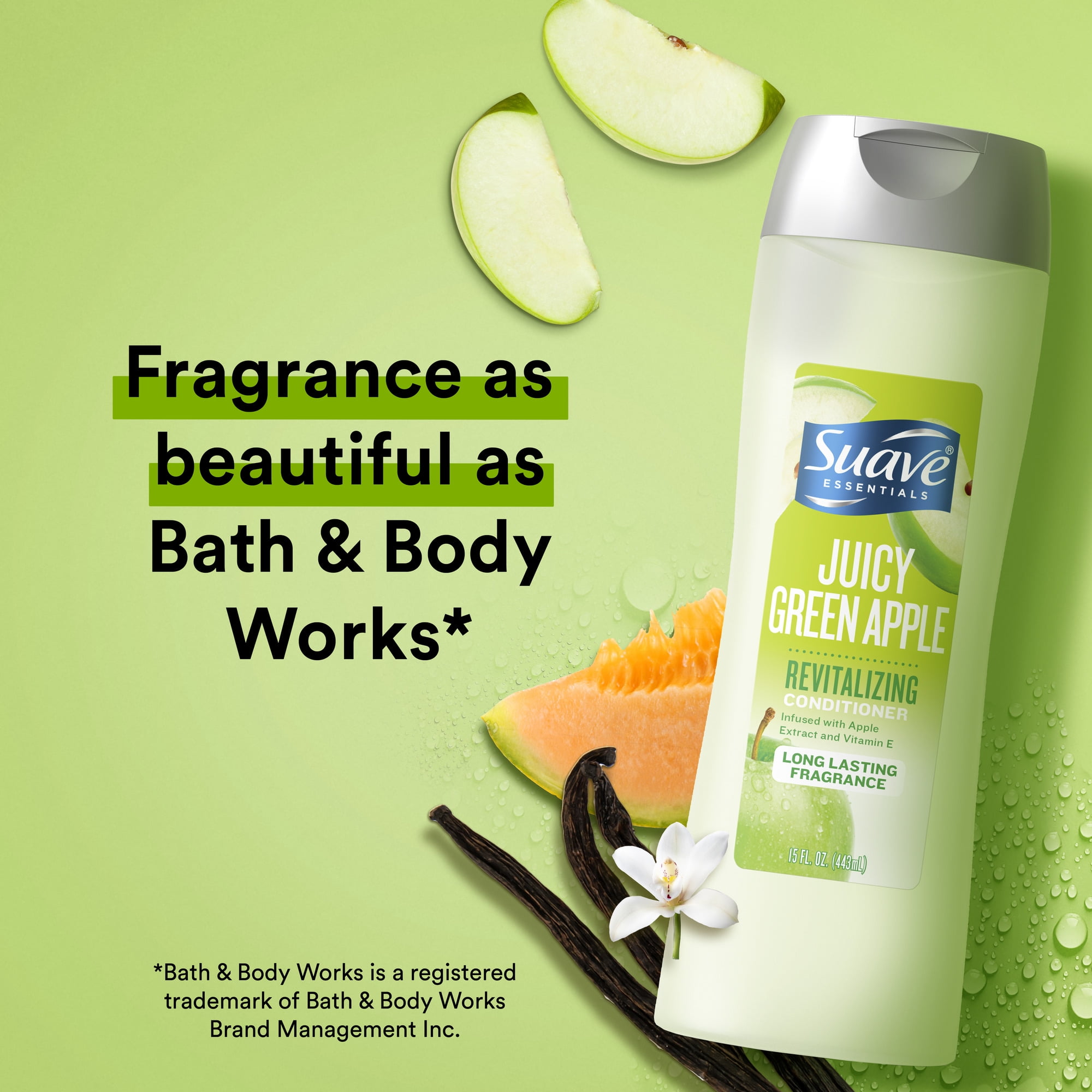 - Suave Essentials Juicy Green Apple Conditioner works best when paired with Suave Essentials Juicy Green Apple Shampoo.