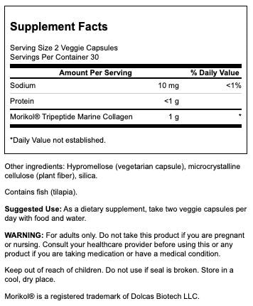Support beauty from within by adding a collagen supplement to your routine . Swanson Marine Collagen Peptides deliver collagen type I to promote skin hydration and elasticity with benefits you can see in as few as six weeks. As we age, the elastin fibers and collagen levels in the skin decrease and our skin is less able to retain moisture. The benefits of collagen supplements include support for the regeneration of collagen and skin fibers so your skin looks and feels soft and supple. Swanson Marine Collagen Peptides feature clinically studied MoriKol(R), a highly bioavailable, marine-sourced material that supplies collagen peptides with a very low molecular weight that allows for greater absorbability. Each 2-capsule serving delivers 1 gram of marine collagen type I.