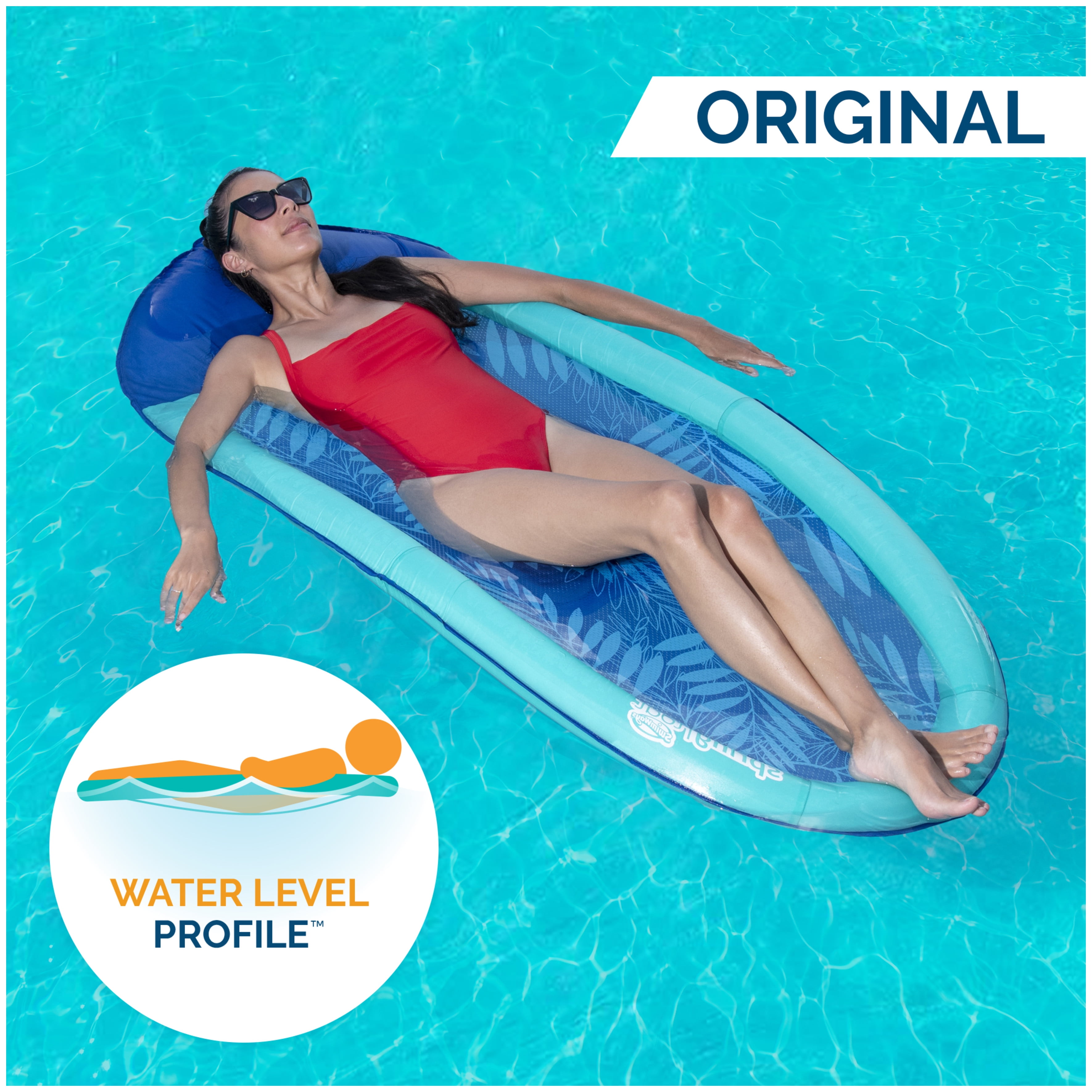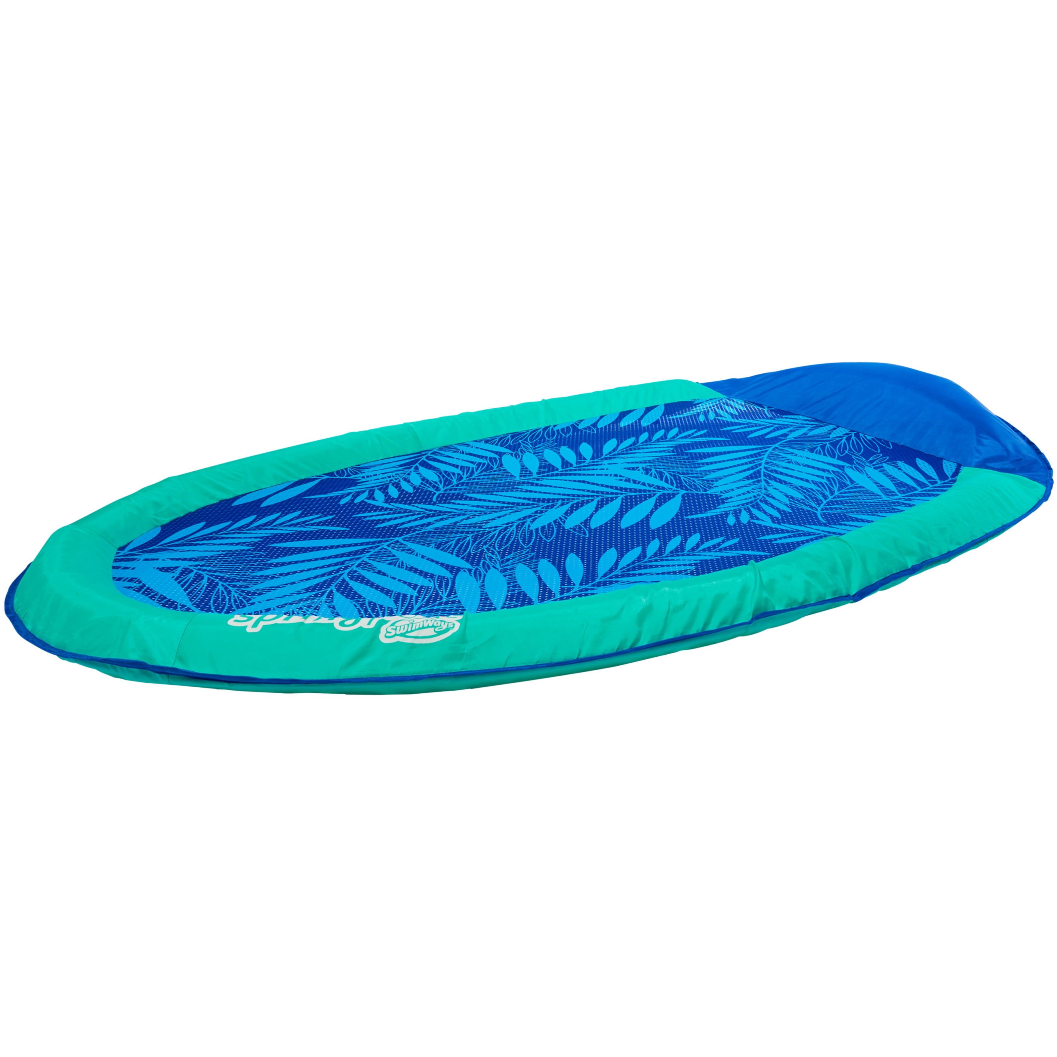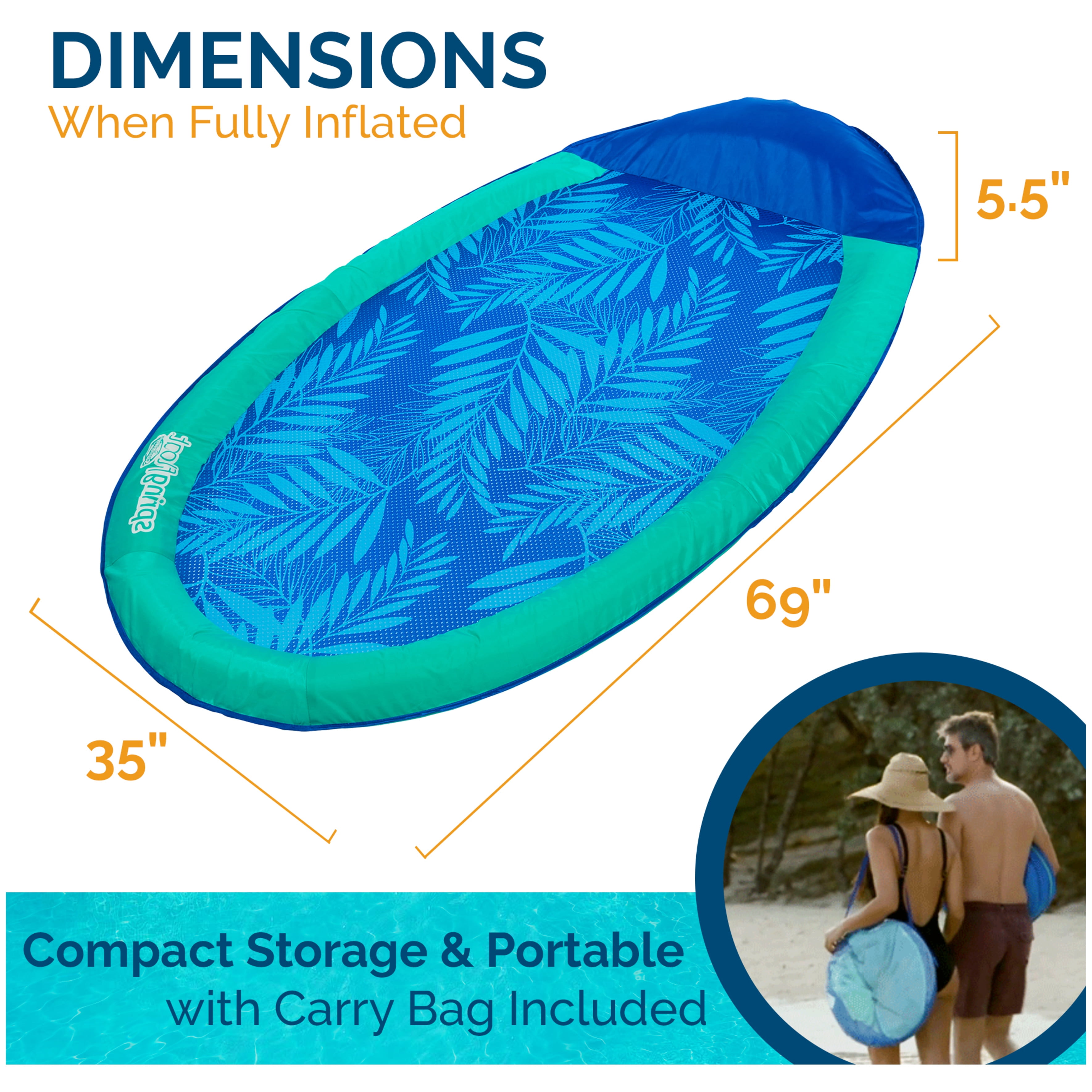 Float through summer, wherever it takes you! SwimWays’ line of foldable, portable Spring Floats keep you comfortably cool for hours of relaxation and fun. Our new and exclusive Hyper-Flate Valve brings you our fastest and easiest inflation ever, so you have more time to spend in the water doing what you love.This hammock-style pool float provides comfortable fabric-covered flotation with original Inner Spring Technology for greater stability in the water. Spring Float also features a durable soft cooling mesh that cradles your body just below the surface of the water, keeping you cool on hot summer days. Lay back and relax on the integrated oversized pillow as the hurry of everyday life drifts away. The patented inner spring along the outside edge of the float provides greater stability and comfort in the water. While our patent-pending unique pump-free Hyper-Flate Valve makes inflation and deflation quick and easy, so you’ll be in and out of the water faster. Folds flat into three compact circles for portability and storage – it’s the perfect pool float to take with you on vacation! Carry/storage bag included. Supports most adults up to 250lbs (113 kg). Dimensions: 68 in x 35 in x 6 in. Sold individually