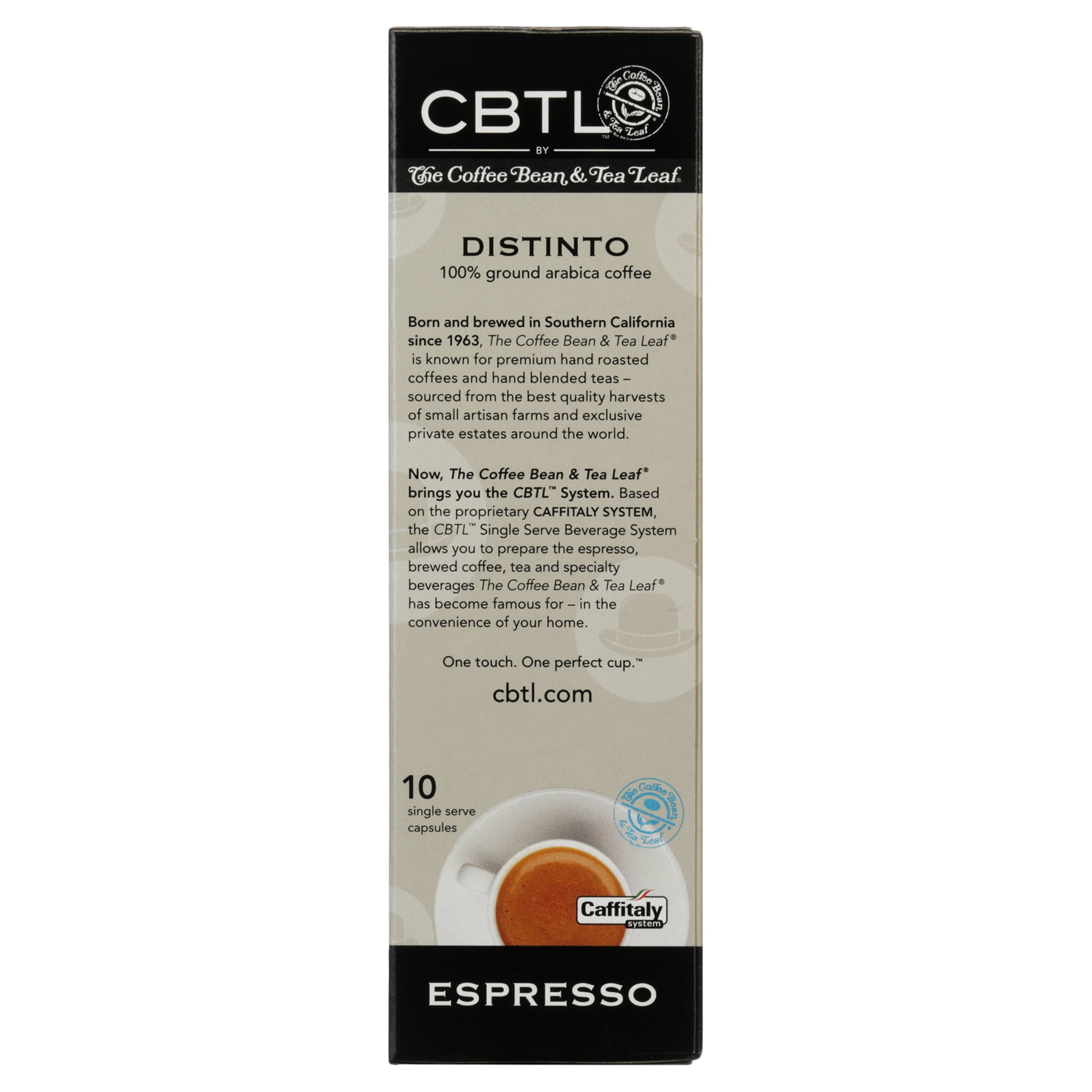 Hand-blended to perfection, beans for our Distinto Espresso are carefully sourced from the top 1% of Arabica beans, then dark-roasted for a bold yet balanced cup. About Our Coffee At The Coffee Bean & Tea Leaf®, the art of crafting the best tasting coffee requires respecting each individual roast. Knowing the specific origin and roast degree for each coffee allows for intense flavor that can be traced back to its earliest beginnings. Many coffee companies claim to search the world for the finest coffees, yet very few do. Our Coffee Master, Jay Isais, goes to the source of our coffee to guarantee it is the highest quality obtainable on earth. The partners who prepare our coffee at every level are extremely passionate people committed to providing ?Simply the Best? coffee to our customers. Quality has always been our No. 1 priority, and it will never be compromised.