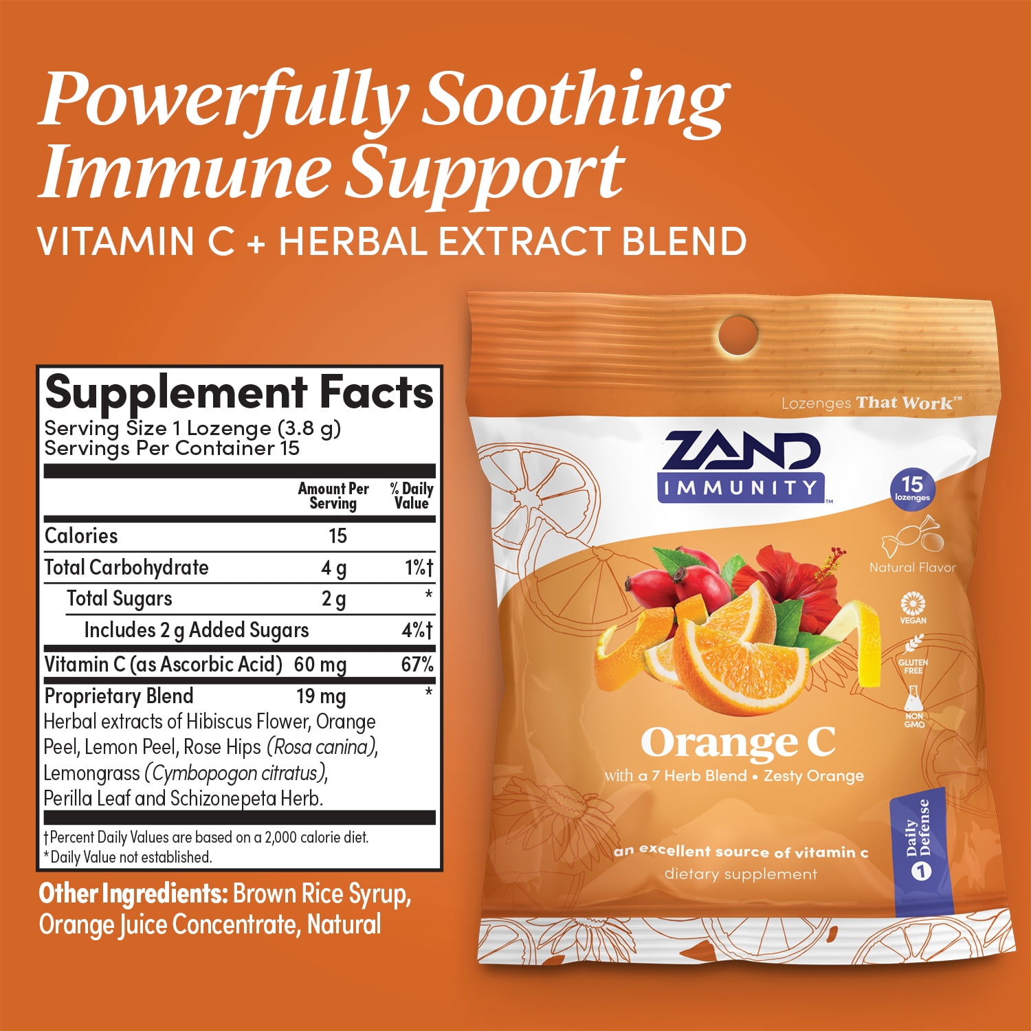 Zand Immunity Orange C HerbaLozenge | Vitamin C Throat Drops w/ Soothing Herb Extracts | Non-GMO (3 Bags, 15 Lozenges)