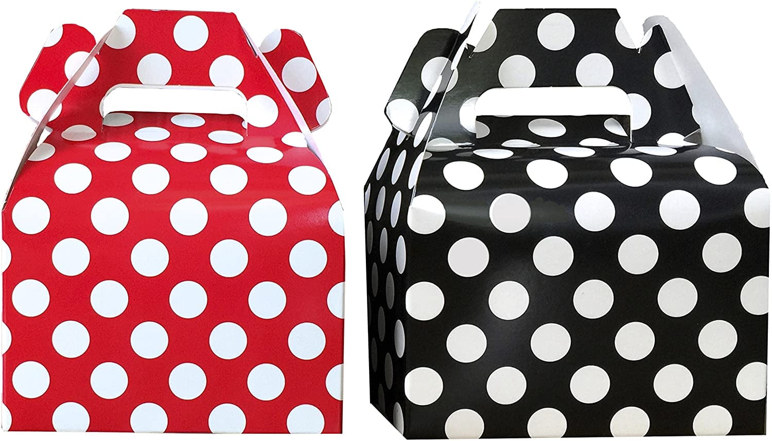 – Paper gable boxes – 12 Red and 12 Black Polka Dot – Measure 4 x 2.5 x 4.75 inches – Ship flat for easy assembly – Fill with candy, cookies, gift cards or small favors – Perfect for a ladybug theme, casino theme, birthday24 Red Black and White Gable Treat Boxes – Dot Ladybug Theme