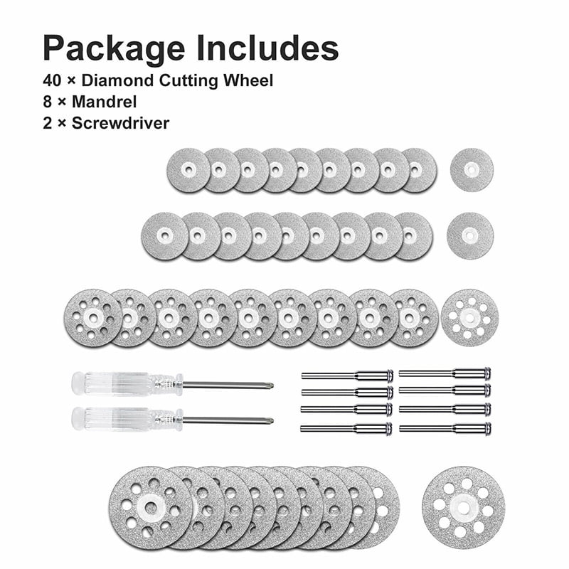 Including: 40pcs diamond cutting wheel (1in/0.87in/0.7in/0.6in, each 10pcs), with 8pcs 0.12in mandrel and 2pcs screwdriver.