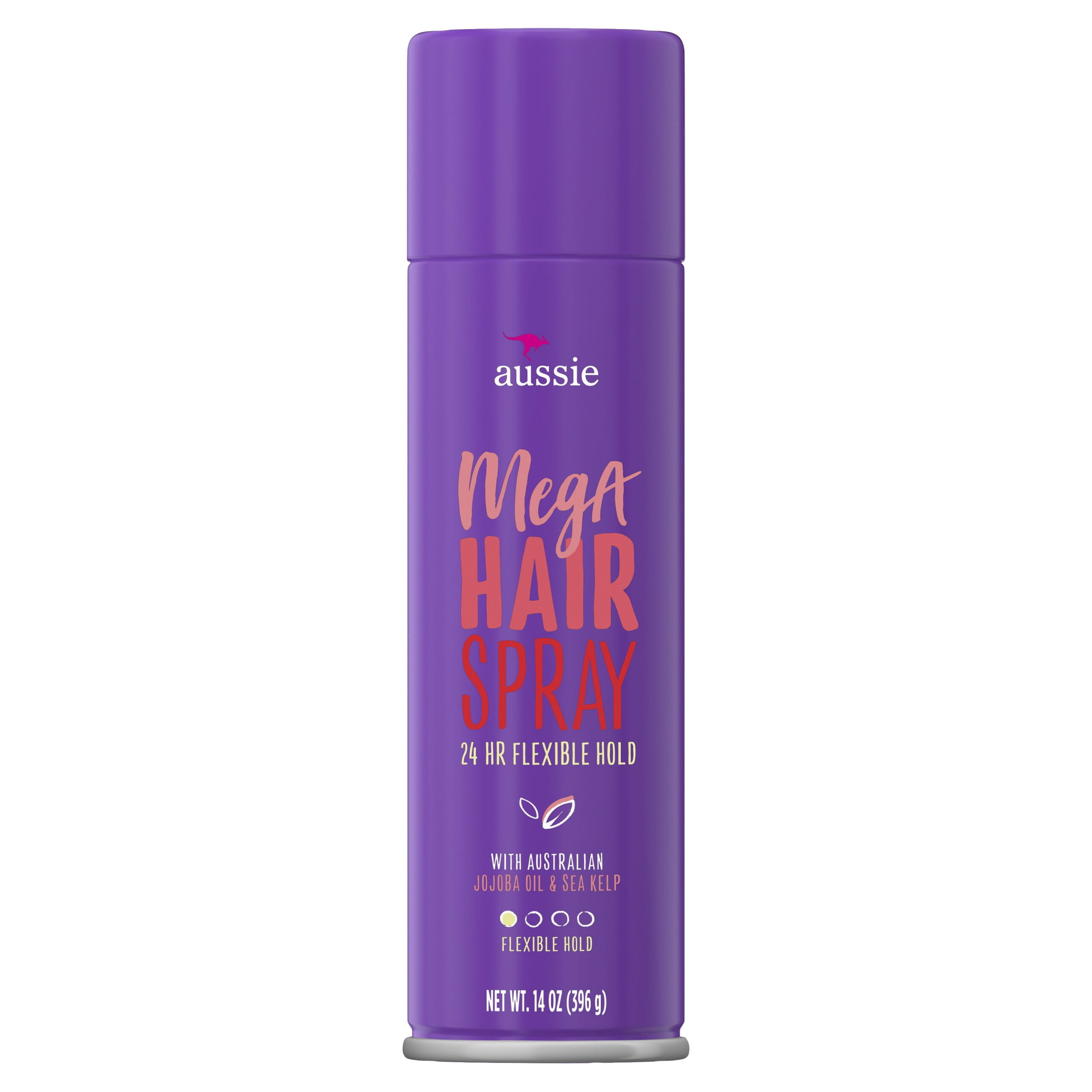 Aussie Mega Hair Spray Flexible Hold, 14 oz ; UPC: 381519187032. Leave the crunch at home with our Mega Hairspray! This gorgeous-smelling formula gives you flexible hold with none of the stiffness, thanks to its super-flexy ways. Unlock mega results and maximum motion with our Mega Hairspray! Our genius scientists have created a formula, infused with Australian sea kelp and jojoba oil, to give you a nourishing and shiny style! And when you’re finished looking glam? Simply brush it out and slip your pj’s on.Aussie Mega Hair Spray Flexible Hold, 14 oz.