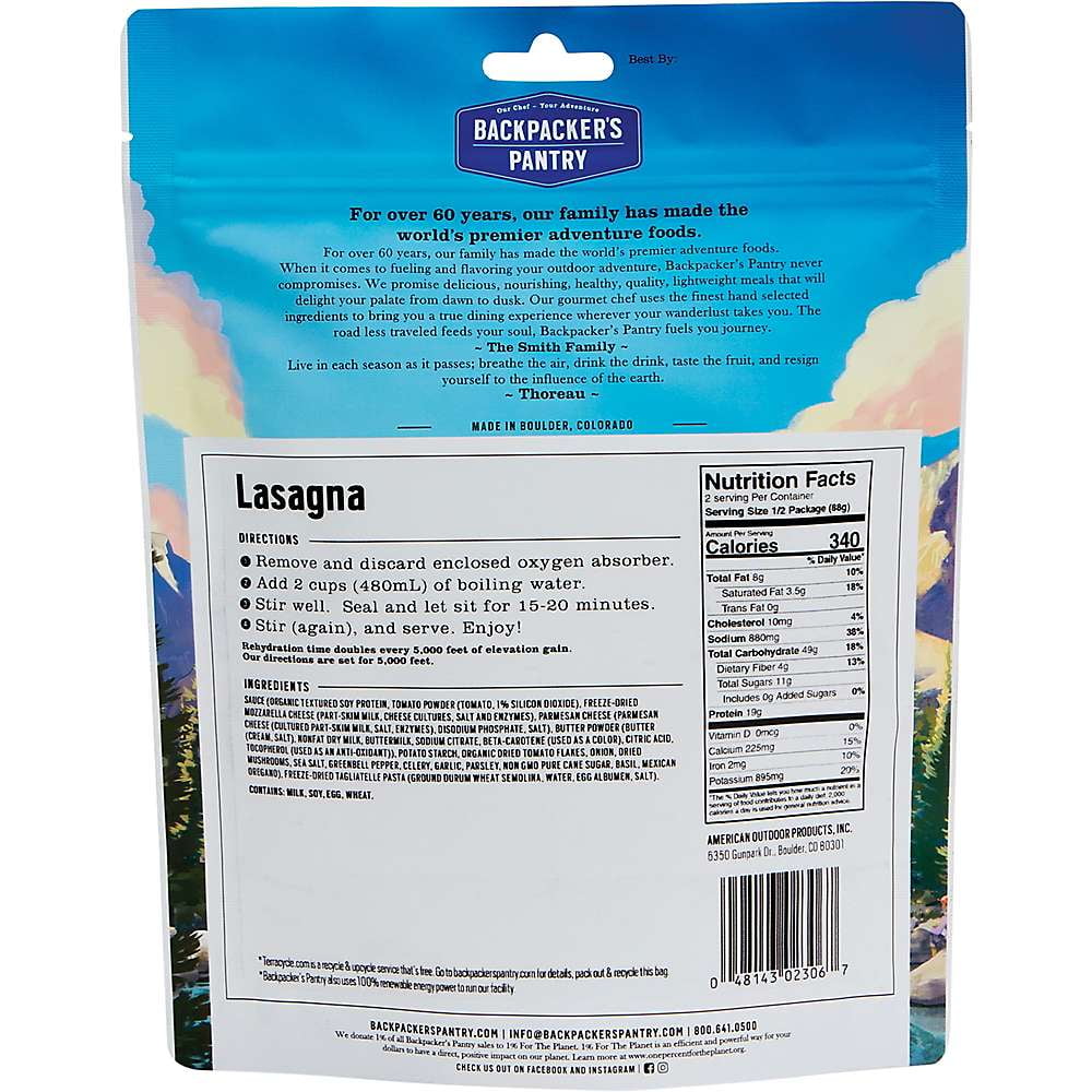 FEATURES of the Backpacker’s Pantry LasagnaPerfect blend of Italian seasonings, tomatoes, Parmesan cheese, noodles, and hearty Organic soy protein in lieu of ground beefIngredients: Sauce (organic textured soy protein, tomato, mozzarella cheese (part-skim milk, cheese cultures, salt and enzymes, microcrystalline cellulose added to prevent caking), parmesan cheese (parmesan cheese (cultured part-skim milk, salt, enzymes), disodium phosphate, salt), butter powder (butter (cream, salt, annatto extract), nonfat dry milk, buttermilk, sodium citrate, citric acid, tocopherol (used as an anti-oxidant), beta carotene (used as a color)), potato starch, mushrooms, onion, salt, bell pepper, celery, garlic, onion, parsley, sugar, basil, oregano), pasta (durum semolina (enriched with niacin, ferrous sulfate, thiamine mononitrate, riboflavin and folic acid))