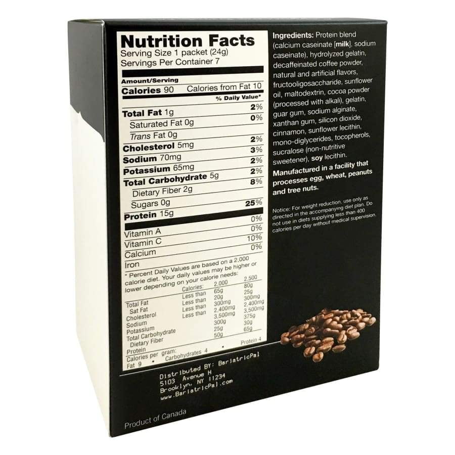 Ingredients: Protein Blend (milk protein isolate, sodium caseinate), Hydrolyzed Gelatin, Decaffeinated Coffee Powder, Natural and Artificial Flavors, Fructooligosaccharides, Sunflower Oil, Maltodextrin, Cocoa Powder (processed with alkali), Gelatin, Guar Gum, Sodium Alginate, Xanthan Gum, Silicon Dioxide, Cinnamon, Sunflower Lecithin, Mono-diglycerides, Tocopherols, Sucralose (non-nutritive sweeteners), Soy Lecithin.BariatricPal Proti-15 Hot Drinks Cappuccino is a dream on cold days. This high-protein filling drink is rich and warming. You can make it with water or make it creamier by using hot milk or almond milk. You can even stir it into decaf or regular coffee for a rich creamy coffee treat that has way less sugar and calories than going to a coffee store. When you start your day with BariatricPal Proti-15 Hot Drinks Cappuccino you cant help but have a great day!Highlights:15 grams protein90 calories10% of the daily value for calciumSuitable for the Pre Op and Post Op Liquid Mushies and Pureed Foods Solid Foods and Maintenance dietsSuitable for gastric band gastric bypass and gastric sleeve patientsSuitable for anyone watching their weightEnjoy anytimeAspartame free7 x BariatricPal 15g Hot Protein Mix Packets Per Box