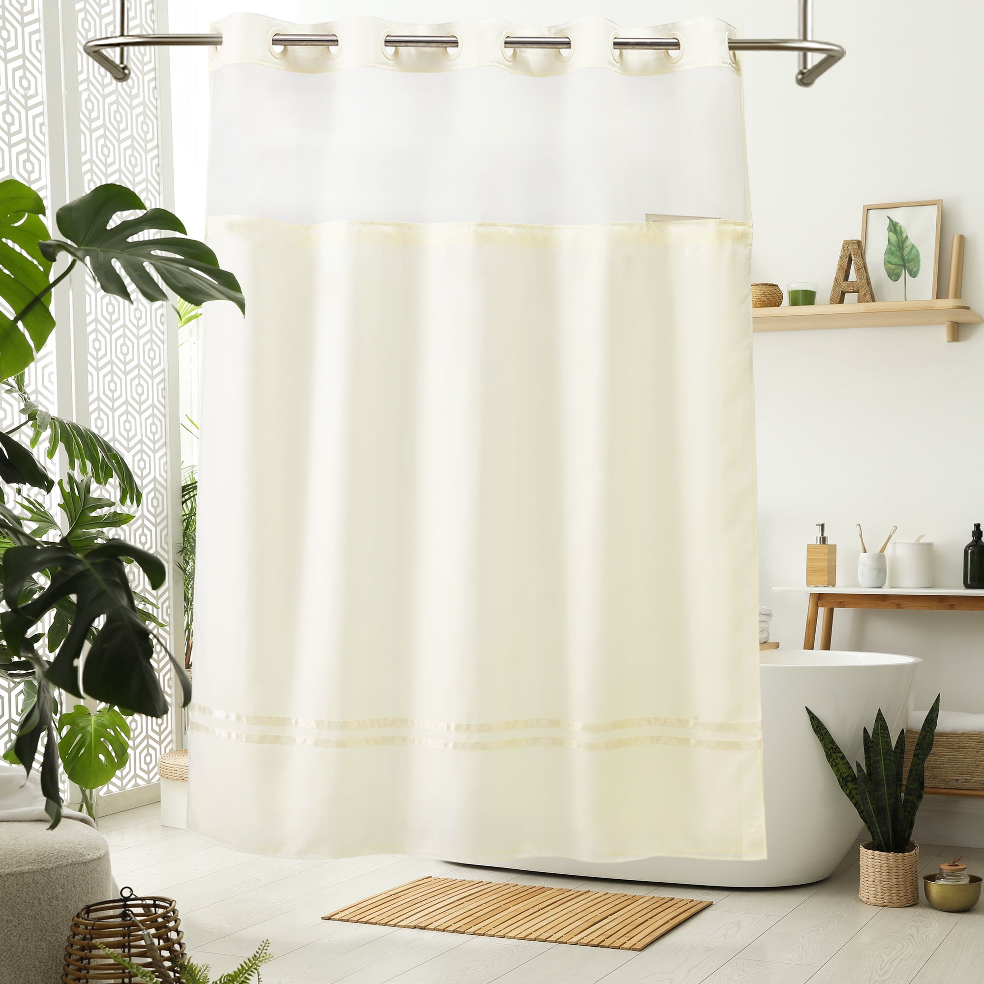 Barossa Design No Hook Fabric Shower Curtain with Liner, Satin Beige Stripe, Mesh Window, Beige -71′ x 74′