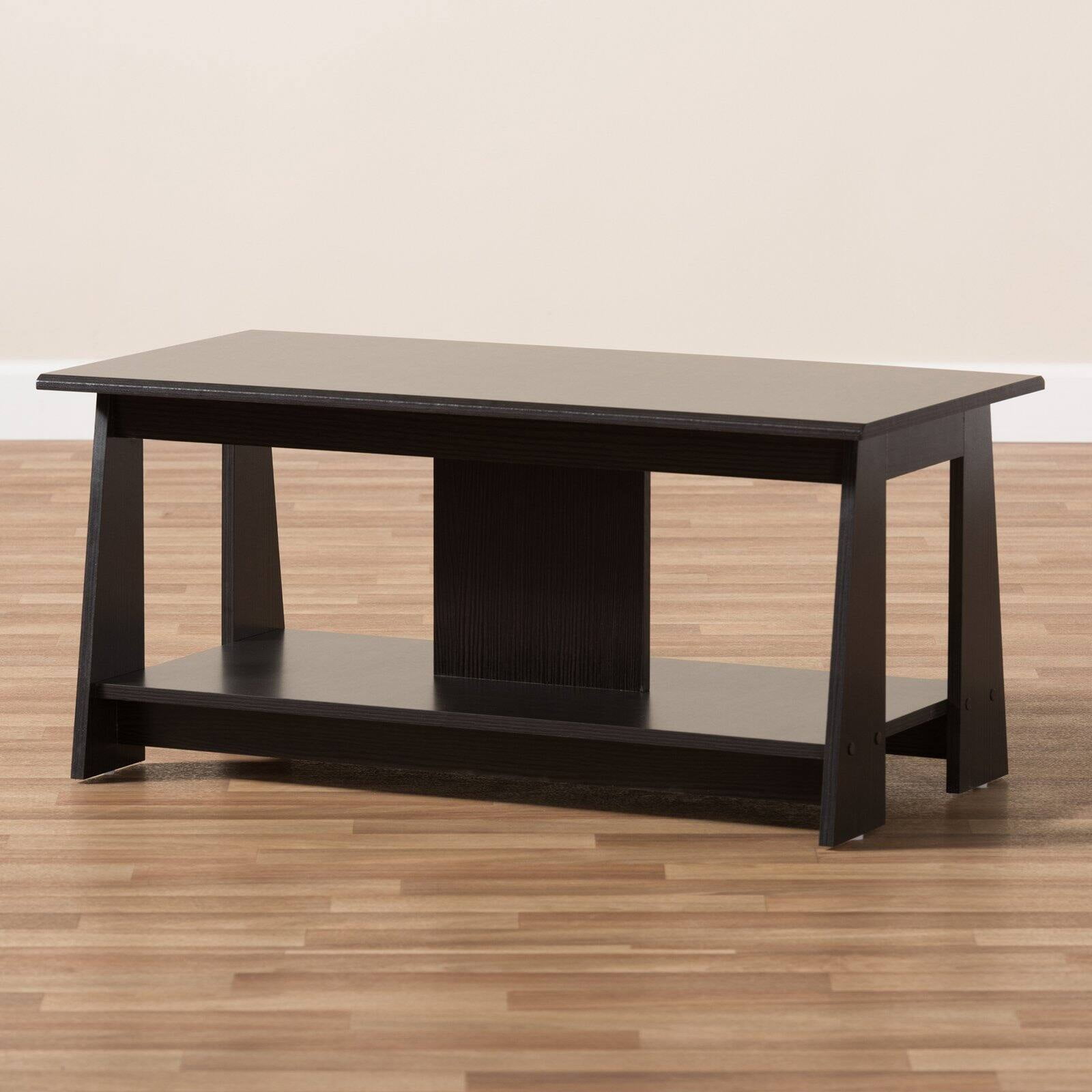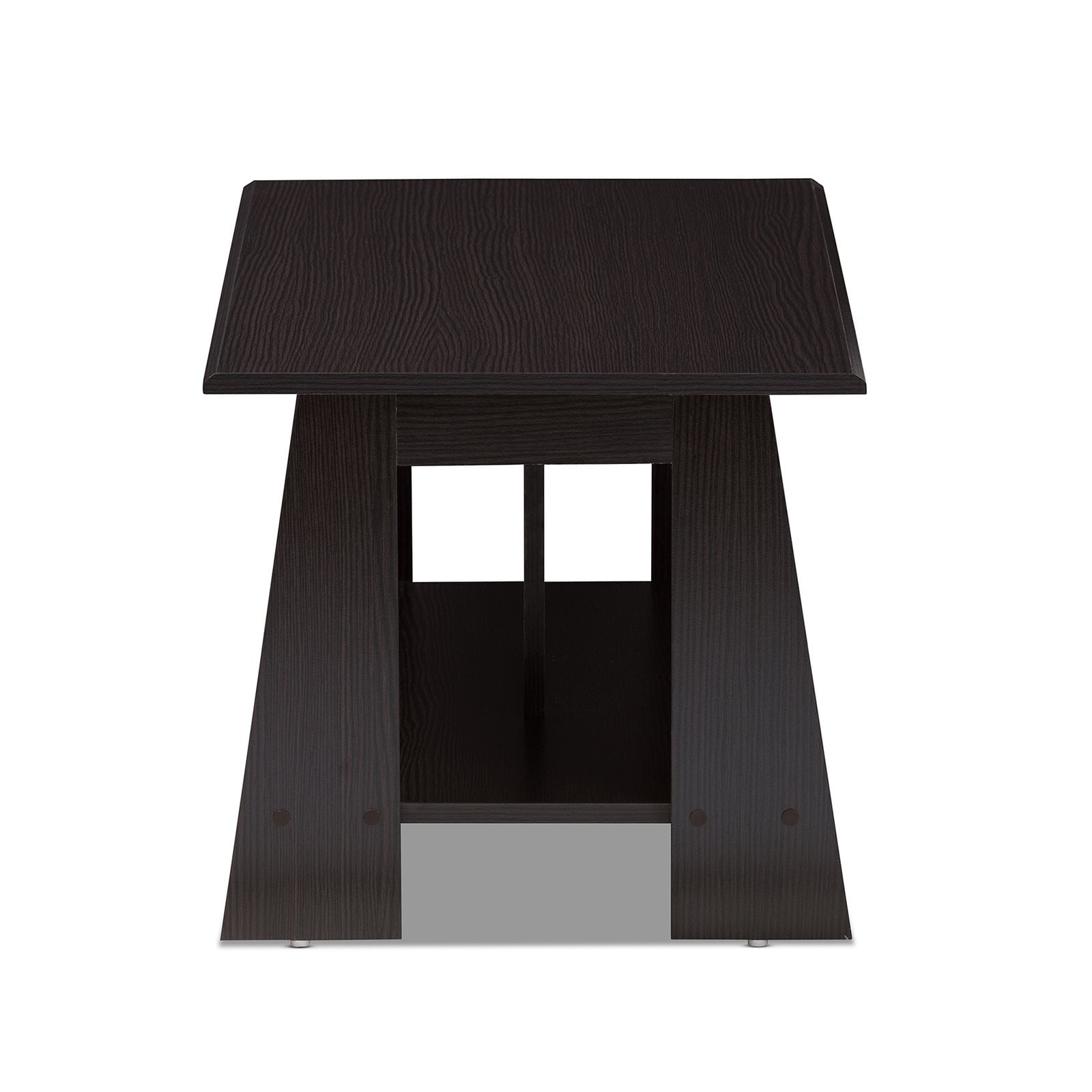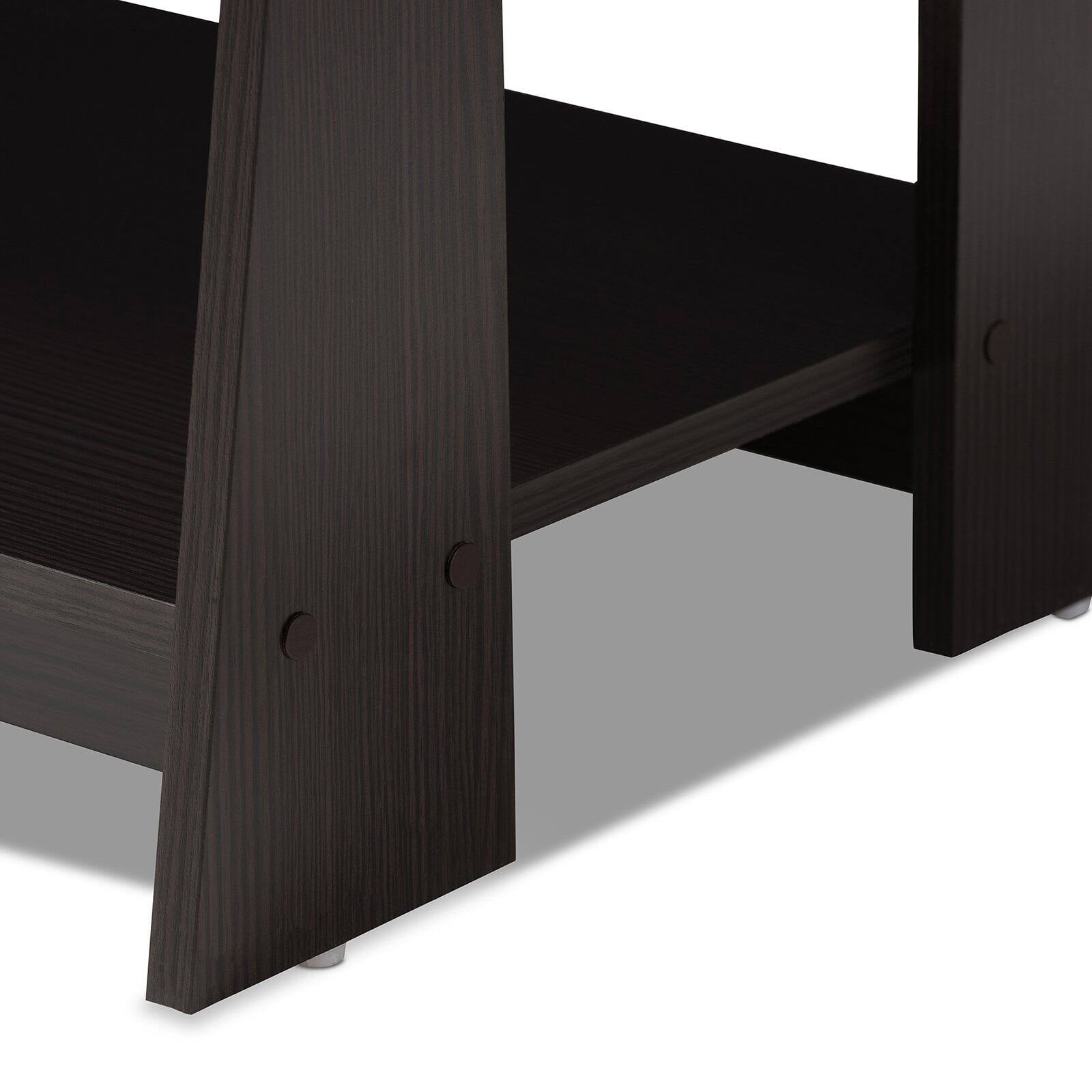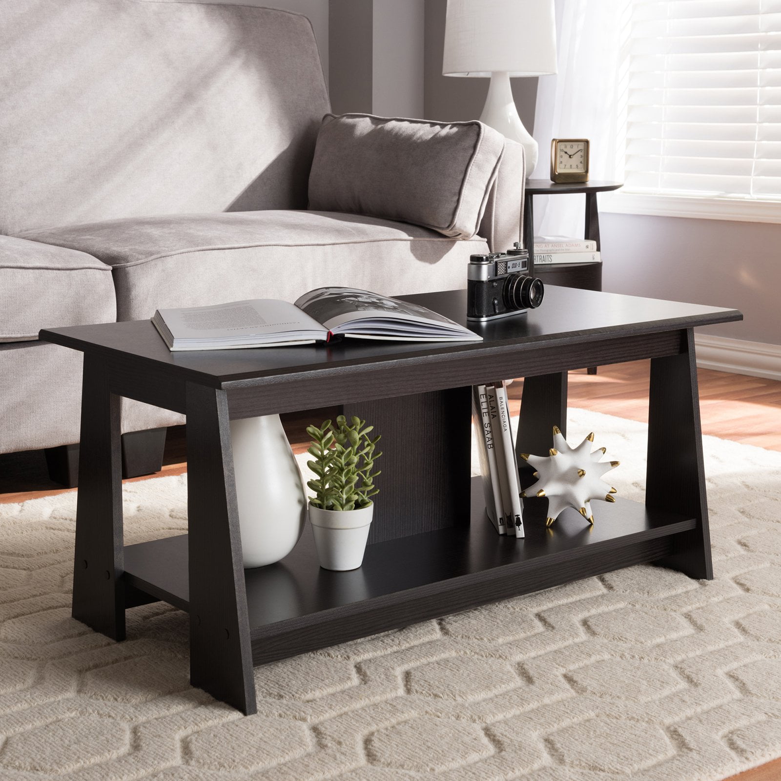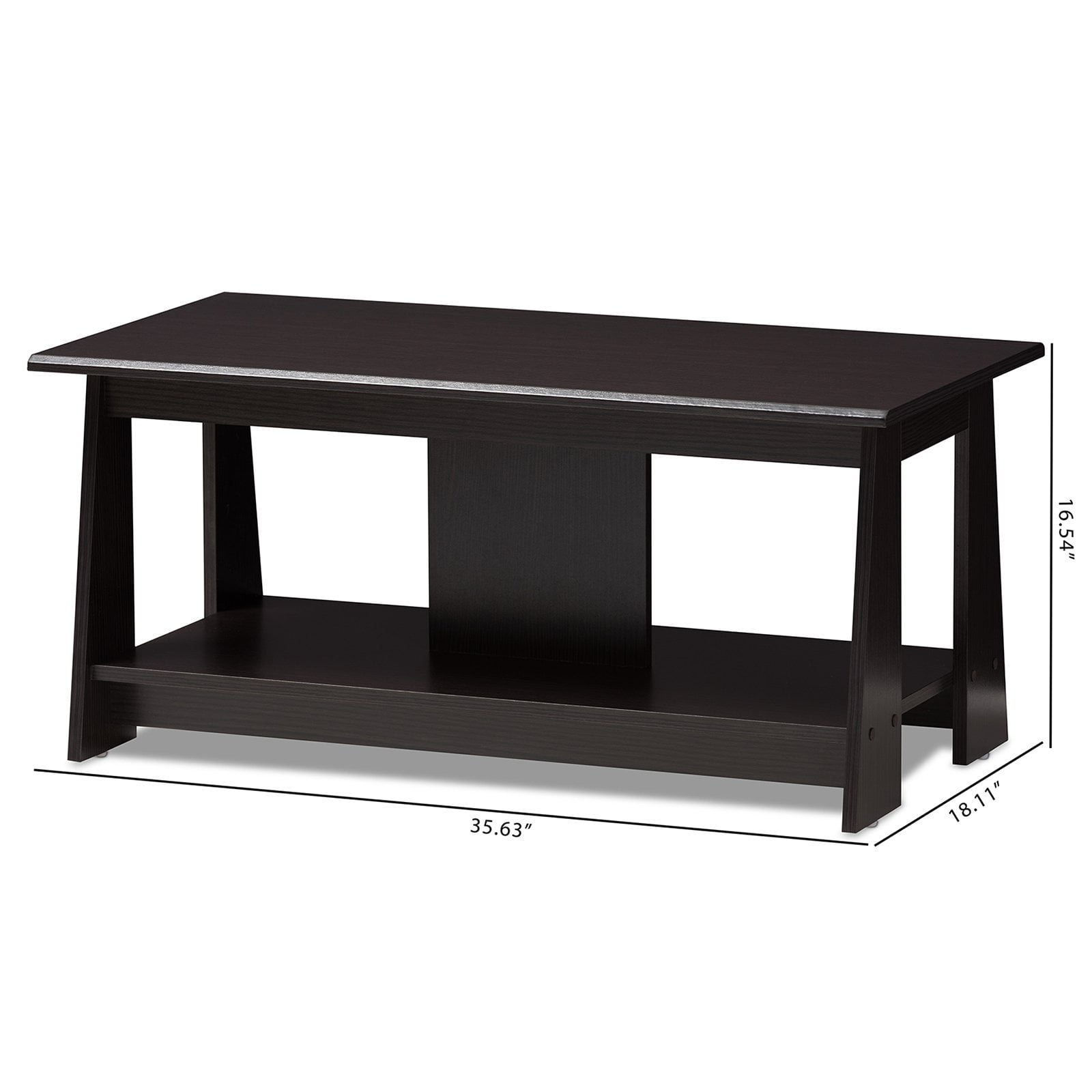 The sleek, energetic look of the Fionan coffee table practically begs to show off its style. The modern and contemporary-inspired design emphasizes clean lines and open spaces. The Fionan has an all-over wenge brown wood finish. The coffee table features a rectangular tabletop perched on sawhorse-style tapered legs. The Fionan also features an open shelf space with a partial divider under the tabletop, giving you endless possibilities for storage or displaying decor. This dynamic coffee table will help you pull the look of your living room together. Made in Malaysia, the Fionan requires assembly.