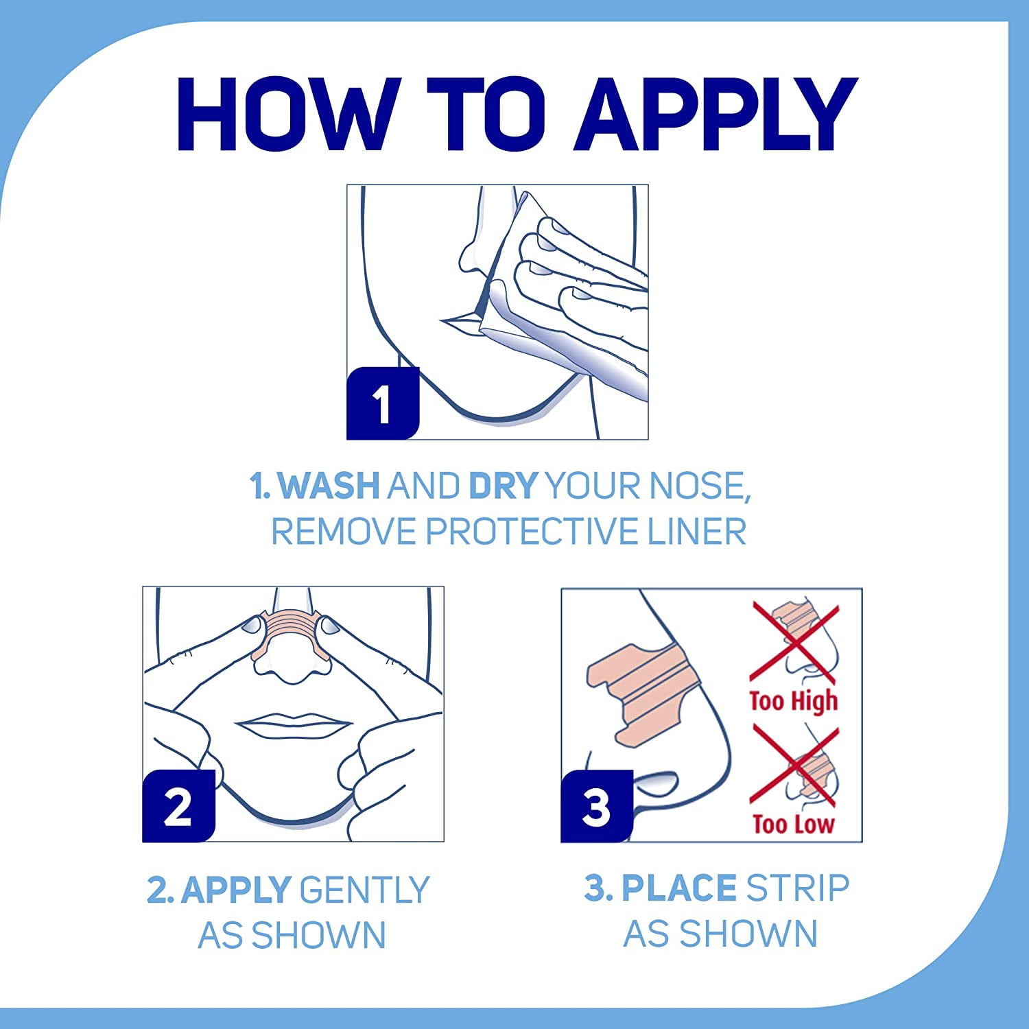 Breathe right, right now.Nasal StripsGlaxosmthklnTry one if you suffer from: SNORING: For best results, use nightly. NASAL CONGESTION due to allergies, colds or deviated septum. Please read enclosed instruction sheet before use for: Complete caution statements. Proper application and removal. Get the right size for best results. Small/Medium: Fits 75% of adult noses.Uses:It’s simple: Flexible ‘spring-like’ bands gently lift nasal passages open. Special adhesive holds strip comfortably in place. Improves airflow up to 31%. Breathe Right Nasal Strips open your nose to help you breathe better so you can sleep better. For sensitive skin. Packaging of this product contains natural rubber latex which may cause allergic reactions.