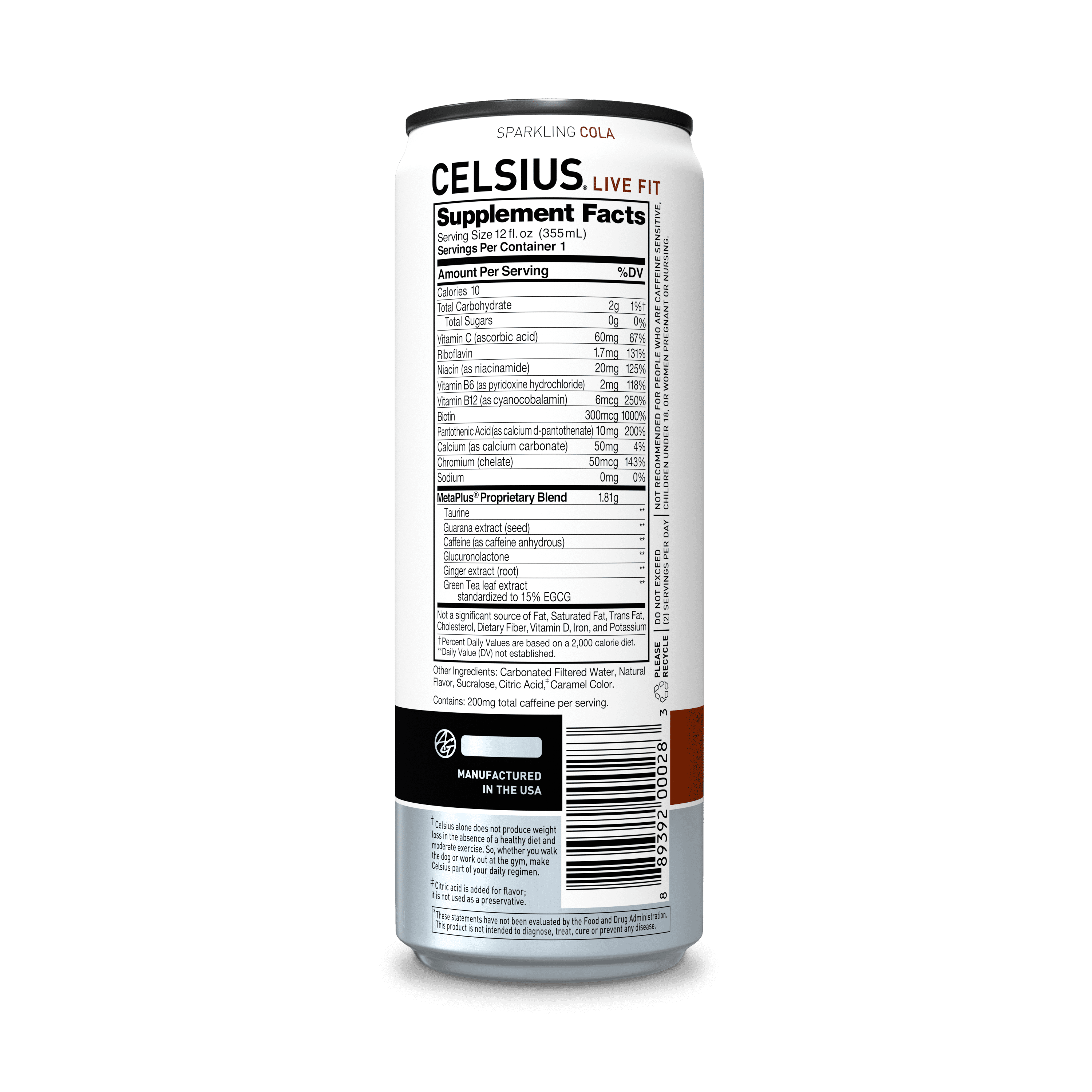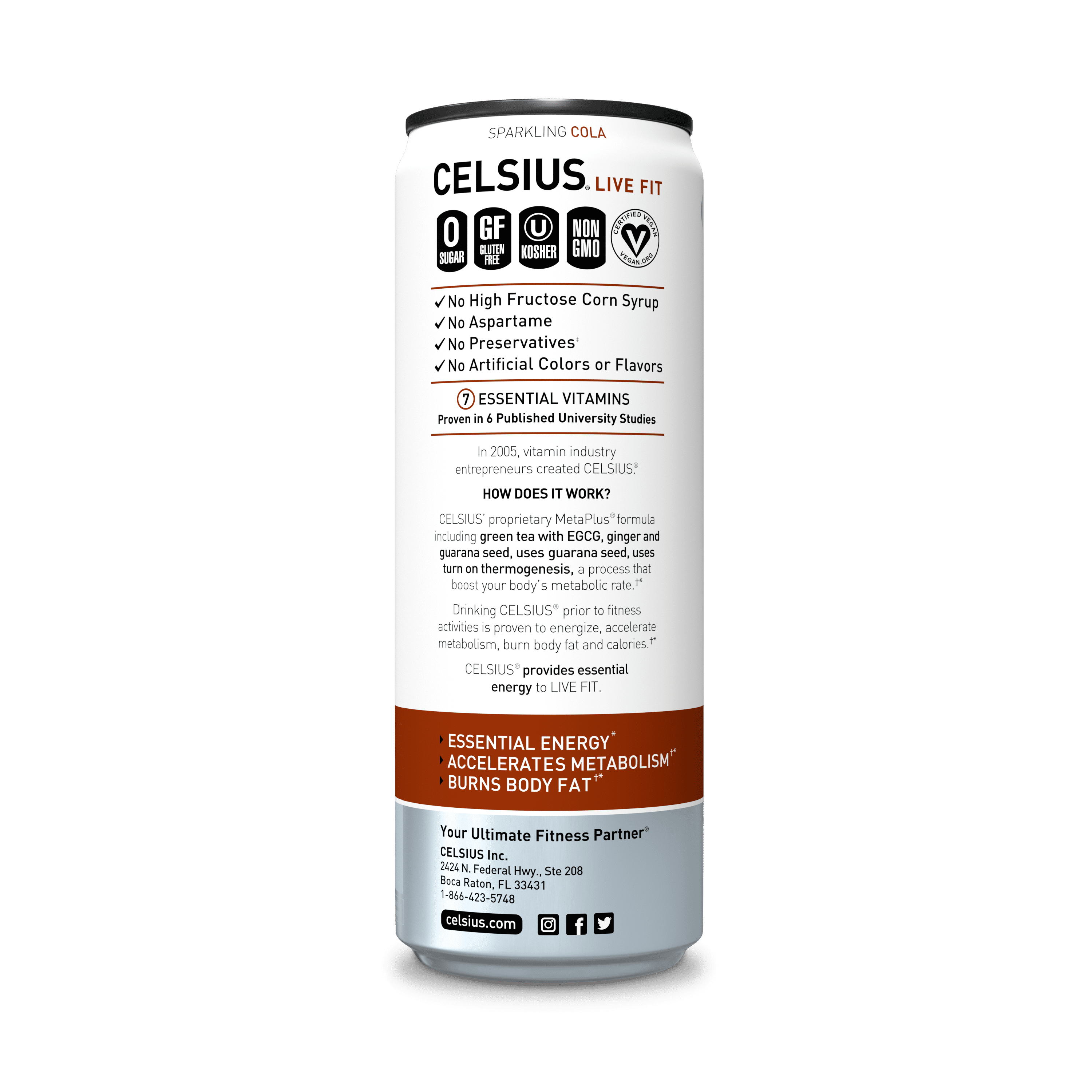 CELSIUS. Live Fit. A uniquely blended formula with healthy energy and key vitamins make CELSIUS an ideal pre-workout drink. It’s low in sodium and contains zero sugar, no aspartame, and no artificial flavors, colors, or preservatives. CELSIUS energy drinks are also Certified Vegan, Kosher, and non-GMO. Its proprietary formula contains green tea extract and EGCG. It also includes guarana seed extract, ginger root for flavor and digestion, vitamin C to support your immune system, vitamin B for energy production, and chromium to help control hunger. Enjoy the taste of Cola without all the sugar and sodium with CELSIUS Sparkling Cola Fitness Drink! It’s carbonated and has the perfect balance of flavor and energy that serves as an awesome pick-me-up for active lifestyles. CELSIUS is available in 12 oz. slim cans and sold in a 12-pack for convenience.