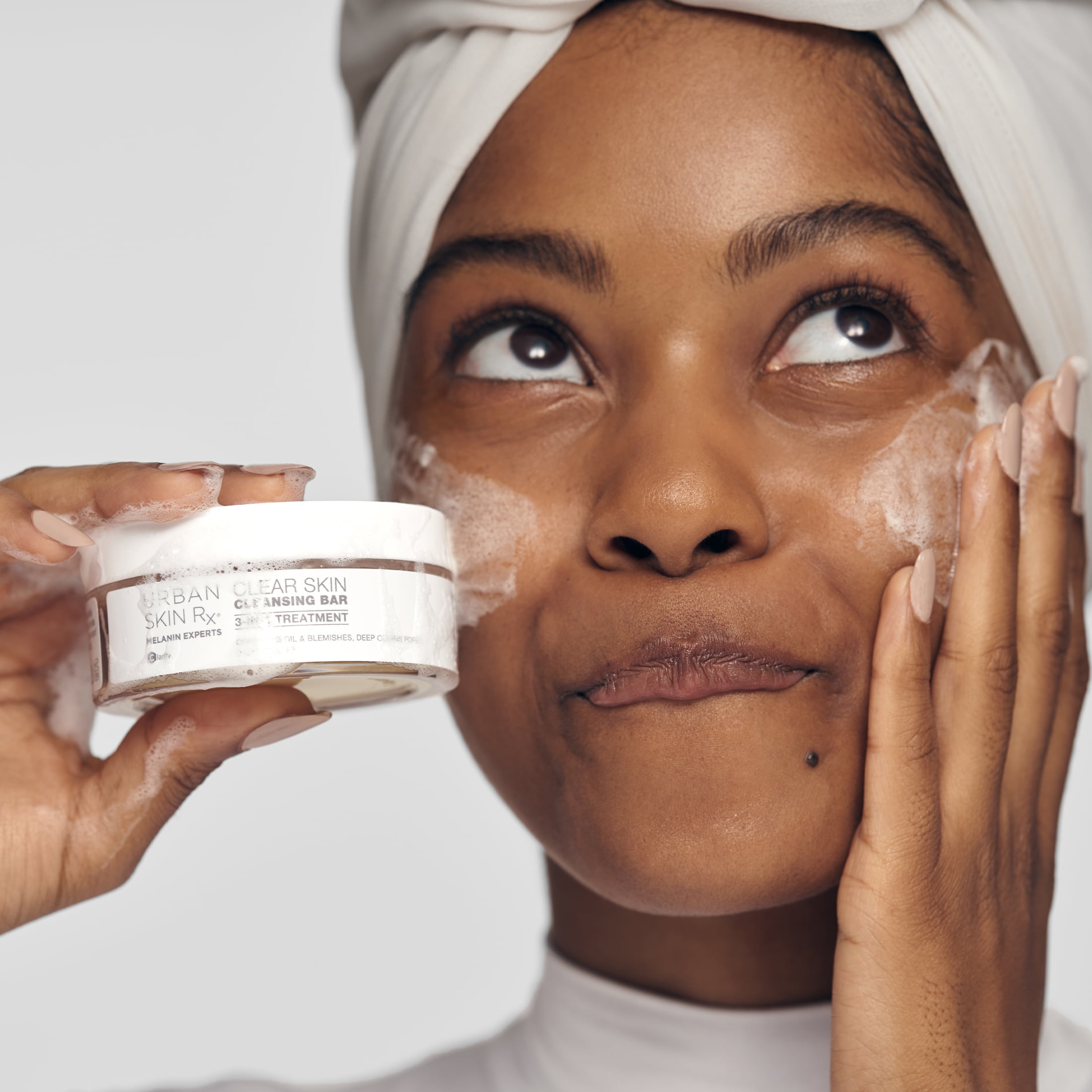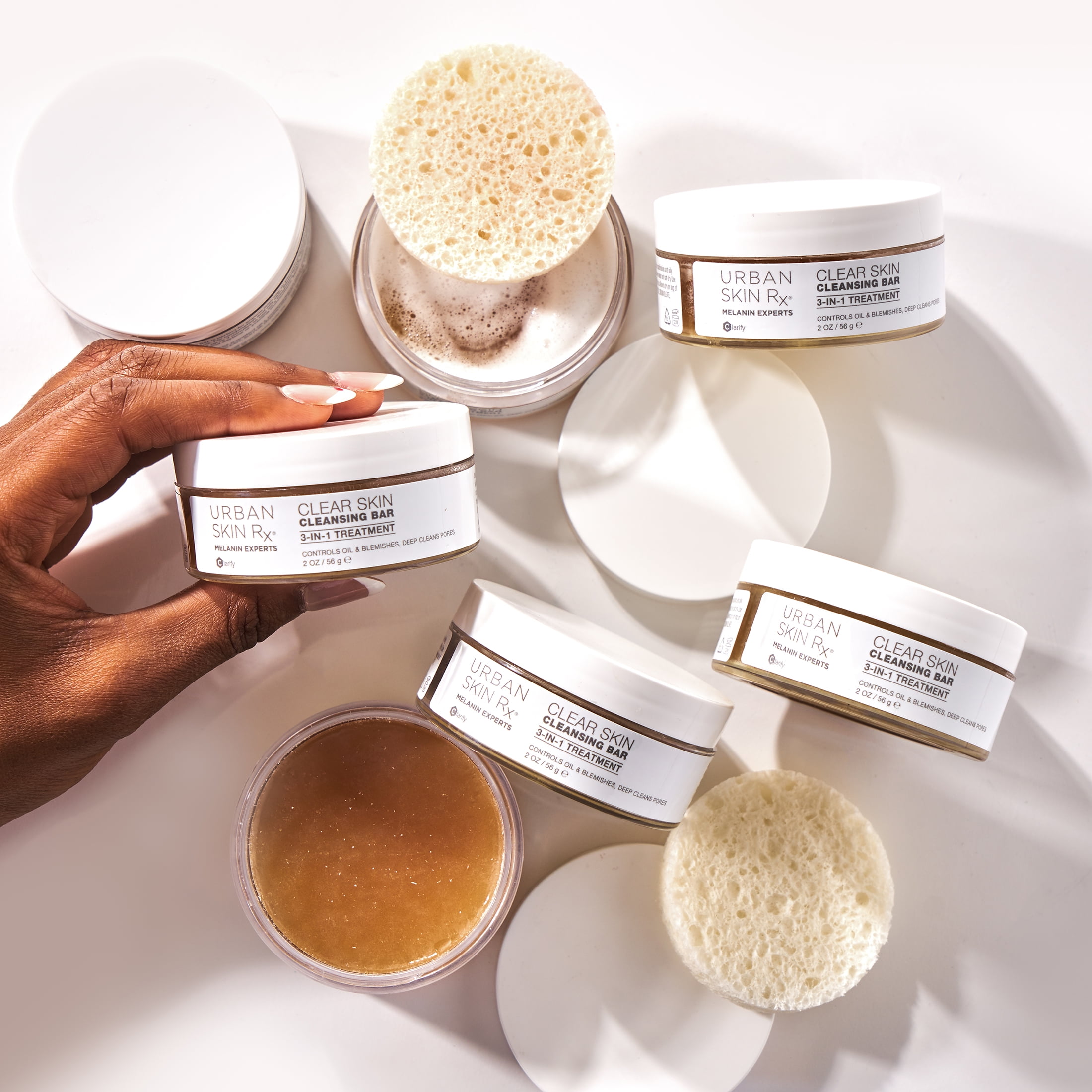 The clear win for clear skin! The Clear Skin Cleansing Bar is our best-selling daily cleanser, mask and exfoliator for oily skin and is formulated to break up with breakouts and post-inflammatory hyperpigmentation. A 3-in-1 product that fights annoying breakouts in the AM and PM. Meet your clear skin best friend! The Clear Skin Cleansing Bar is a pore-clarifying cleanser, mask and exfoliator that helps you get a handle on oily skin and breakouts while boosting even-looking skin. The best-selling formula features two of our favorite blemish-fighting ingredients Salicylic Acid and Sulfur, which team up to exfoliate dead skin, improve the look of breakouts and remove excess oil from the skin. Meanwhile our ClearTone Advanced Technology® works overtime to improve the look of dark marks and uneven skin tone left behind by blemishes. Lightly scented with the aroma of Eucalyptus Leaf Oil, this bar not only transports you to the spa, but also cleanses surface-level impurities that can lead to breakouts, uneven skin tone and a dull complexion. To transform this bar in a jar into a lightweight airy lather, moisten the enclosed sponge and rub it around the bar to get it nice and foamy. Gently massage the pad on your face in circular motions. Need a quick mask treatment? Leave on for 2-3 minutes, rinse and you’re ready for your other serums and moisturizers.