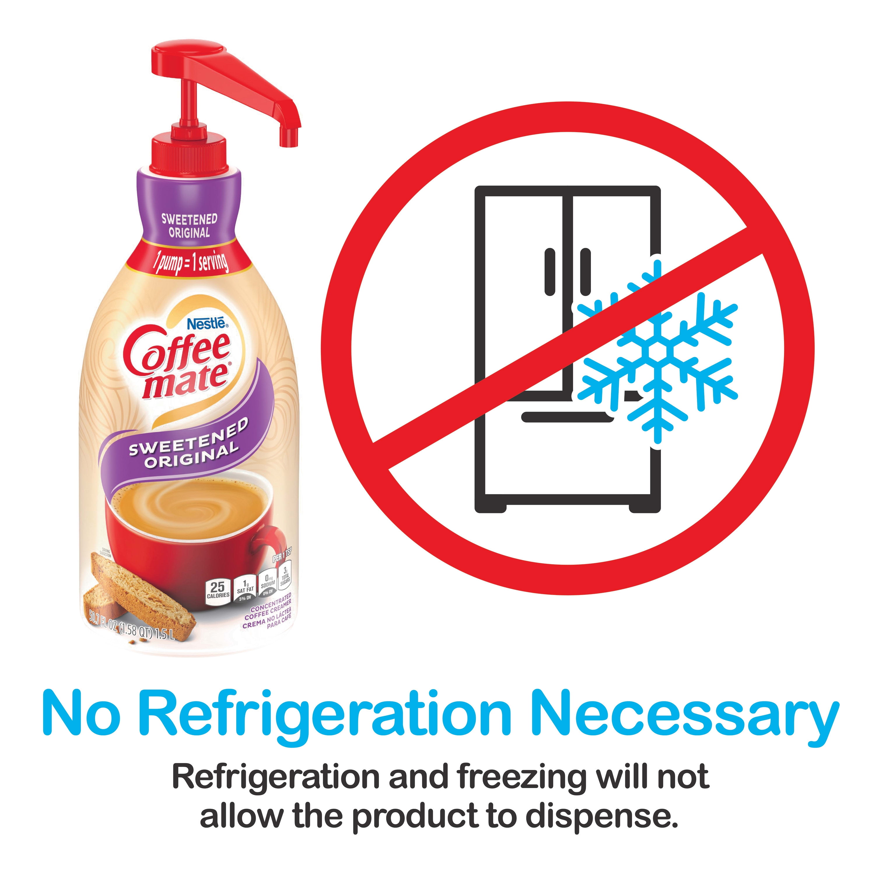 Nestle Coffee mate Liquid Concentrate Pump Bottle, Sweetened Original is a classic favorite. Sweetened Original offers a deliciously rich, velvety smooth creamer finish that will enhance and enrich your coffee offering. Packaged in a 1.5 L liquid concentrate pump bottle, this format is the perfect easy to use, convenient solution for your customers. This liquid concentrate creamer does not need to be refrigerated and will retain its great flavor at room temperature for up to 9 months. Its unique pump system locks the pump to the bottle once installed, making it impossible to remove and entirely tamper proof. You’ll benefit from our no mess, easy to clean, reduced waste pump bottle format, and your customers will love the classic, irresistible flavor.Coffee mate is America’s #1 coffee creamer. With a variety of flavors and formats, Coffee mate has your coffee creamer needs covered. Delight your employees, customers and guests by offering Coffee mate liquid creamer in your workplace, break room or kitchen.