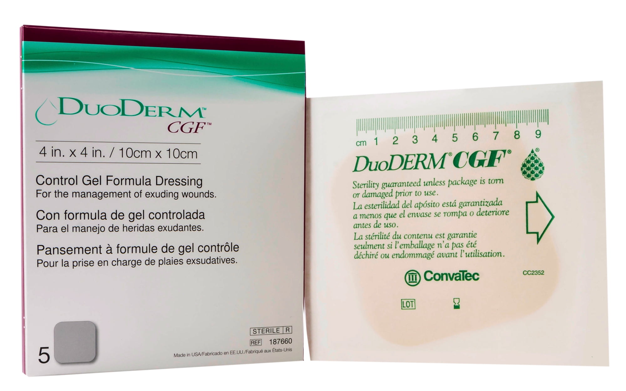 DuoDERM CGF dressing is a hydrocolloid, moisture-retentive wound dressing used for partial and full-thickness wounds with exudate. It incorporates a unique ConvaTec hydrocolloid formulation that distinguishes it from other hydrocolloid dressings.