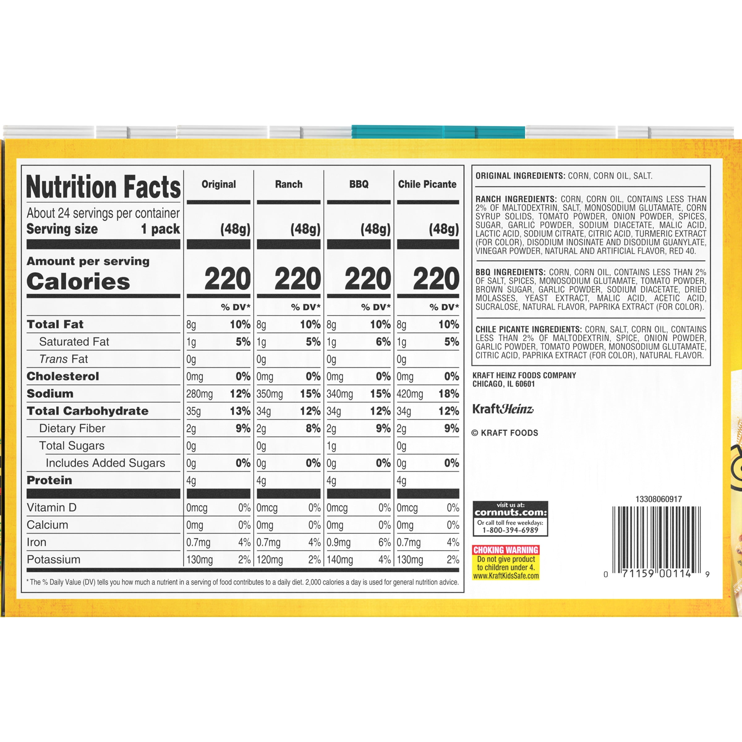- Each box of Corn Nuts Crunchy Corn Kernels includes 10 Original, 6 Ranch, 4 BBQ, 4 Chile Picante con Limon