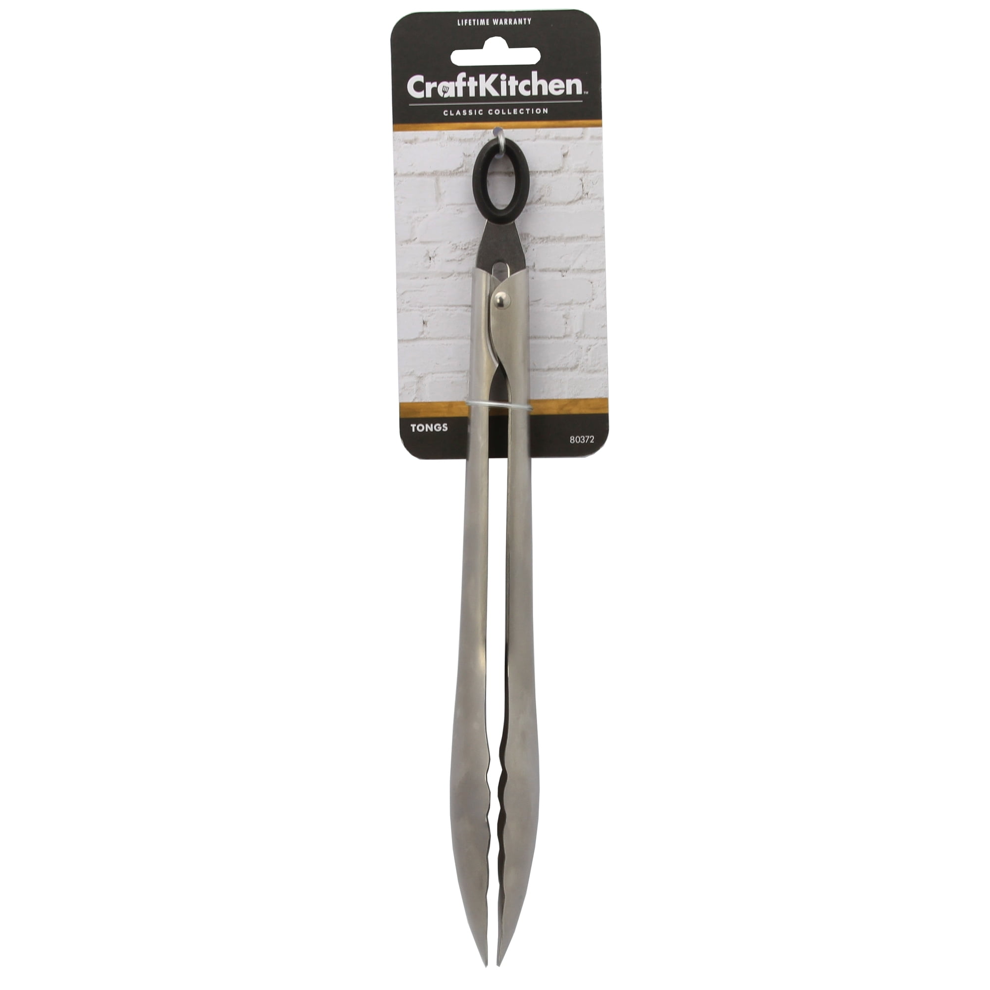The Craft Kitchen Tongs are made from brushed stainless steel for durability. The 10 inch tongs allow you to easily grab and flip food. Tongs can be locked in the closed position for convenient storage. The pull-tab for locking also doubles as a hole for hanging. Dishwasher safe for easy clean-up. Lifetime warranty.