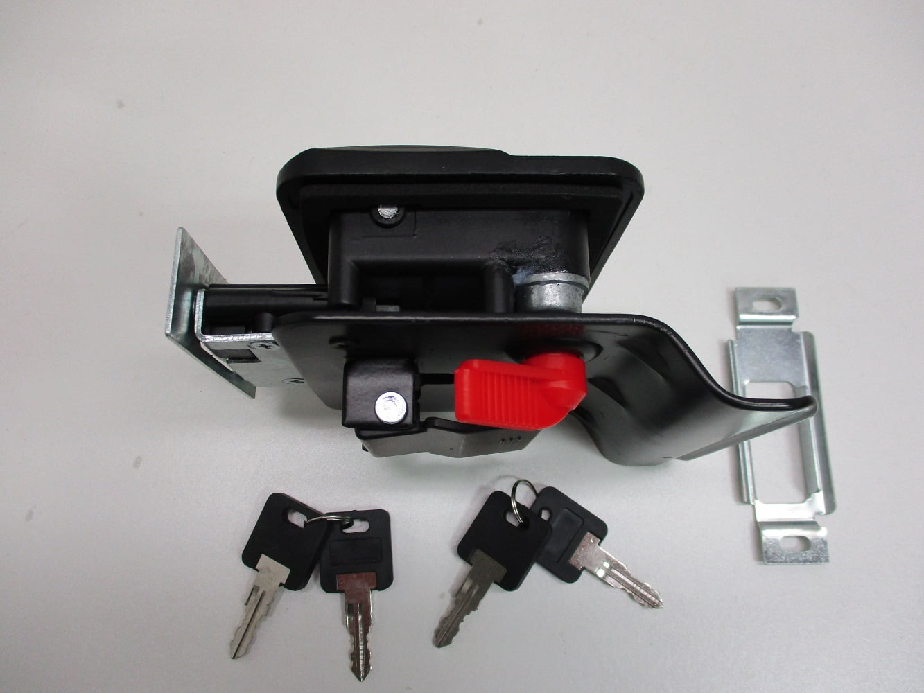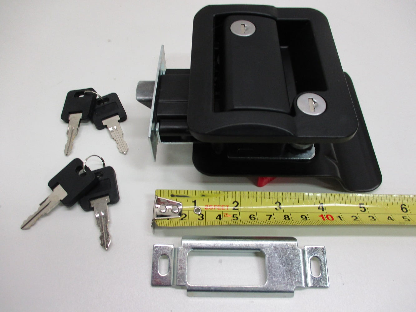 Generic Replacement Black RV Camper Trailer has Entry Door Latch Assembly. Black Camper RV Trailer Entry Door Latch with Deadbolt. Generic Replacement Latch Assembly. Fits Most Standard RV Camper Utility Cargo Trailer Doors. Includes Latch Assembly, Strike Plate and 4 Matching Keys. Screws For Strike Plate are Not Included. Solid Metal Construction.