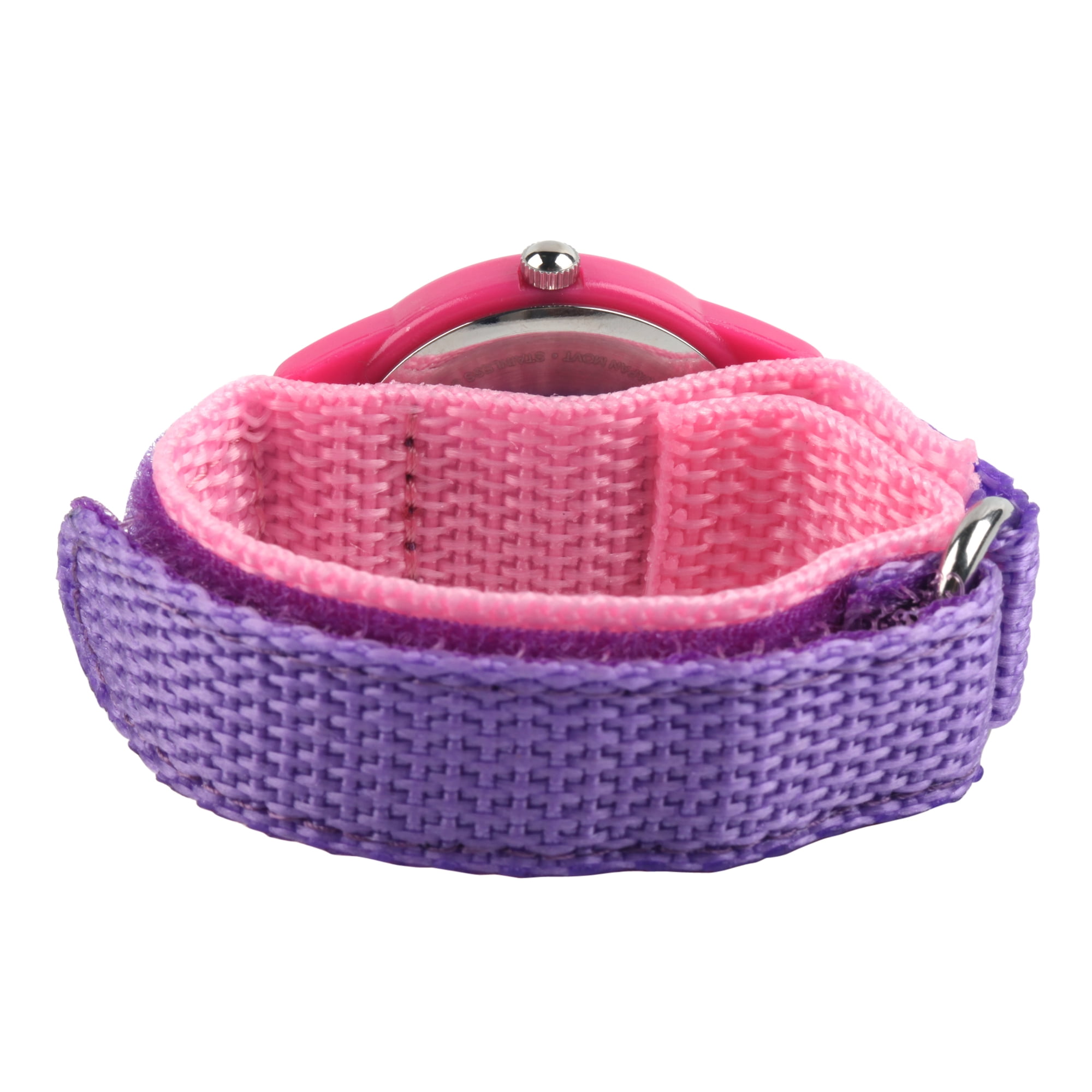 Disney Princess Cinderella, Ariel, Brave, Mulan, Pocahontas, Rapunzel, Belle, Sleeping Beauty, Snow White, Jasmine, Tiana, Girls’ Pink Plastic Time Teacher Watch, Purple Hook and Loop Nylon Strap with Pink Backing, WDS000849Water-resistant to 3 ATM