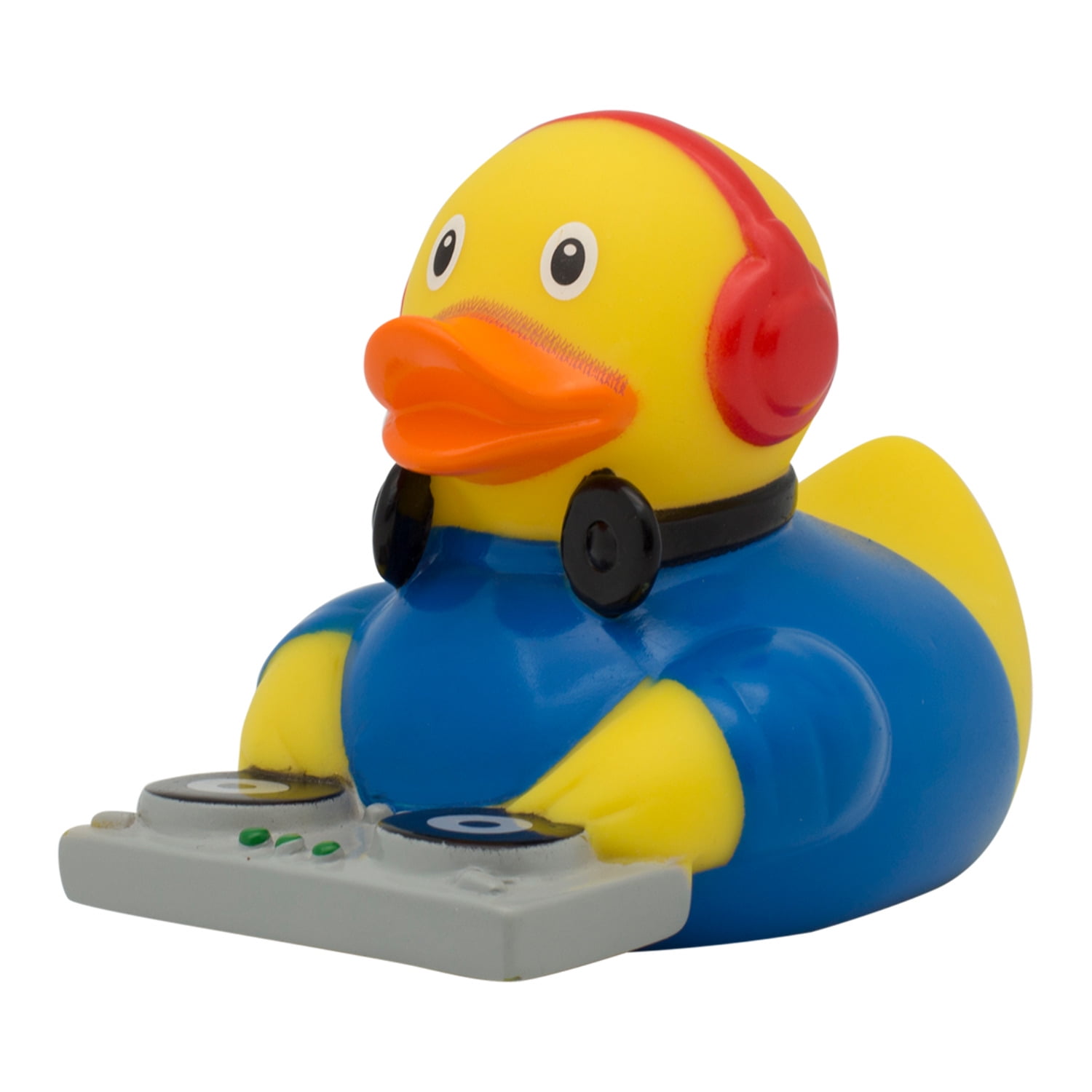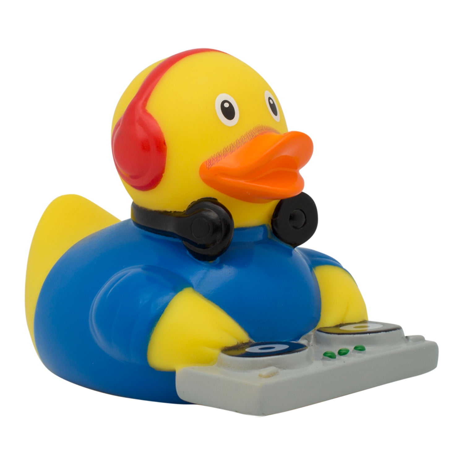 Approximate Size: 3 W x 3.5 H x 3.5 L Squeaky: bottom has hole so it squeaks Materials: Made of vinyl. Lead free and phthalate free Caution: Small toys pose a choking hazard to children under the age of three. Use proper supervision.DJ Music Mix Rubber Duck