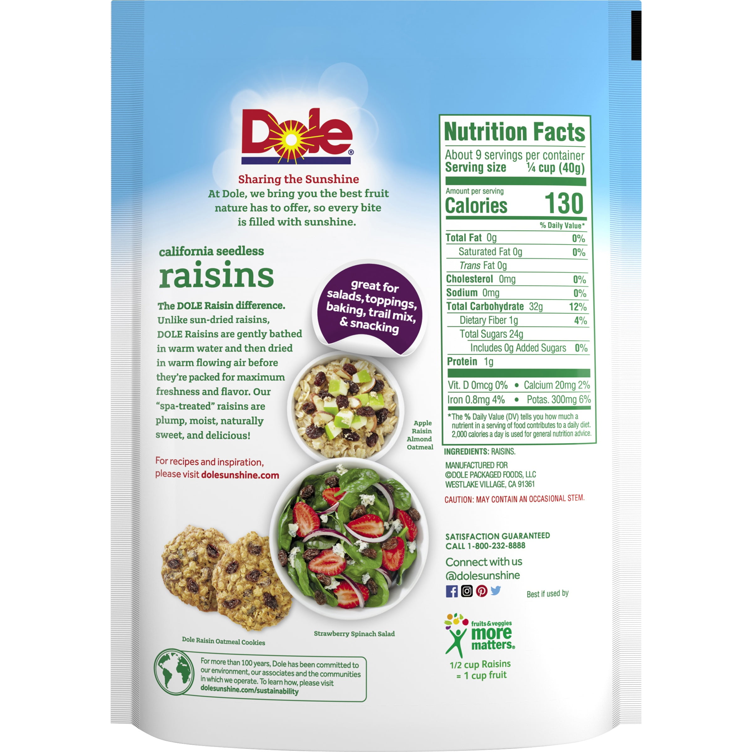 - DELICIOUS CALIFORNIA RAISINS: With Dole’s shelf-stable raisin products, you can have the sweet taste of California raisins anywhere & anytime. For another delicious, dried fruit snack try DOLE California Dates.