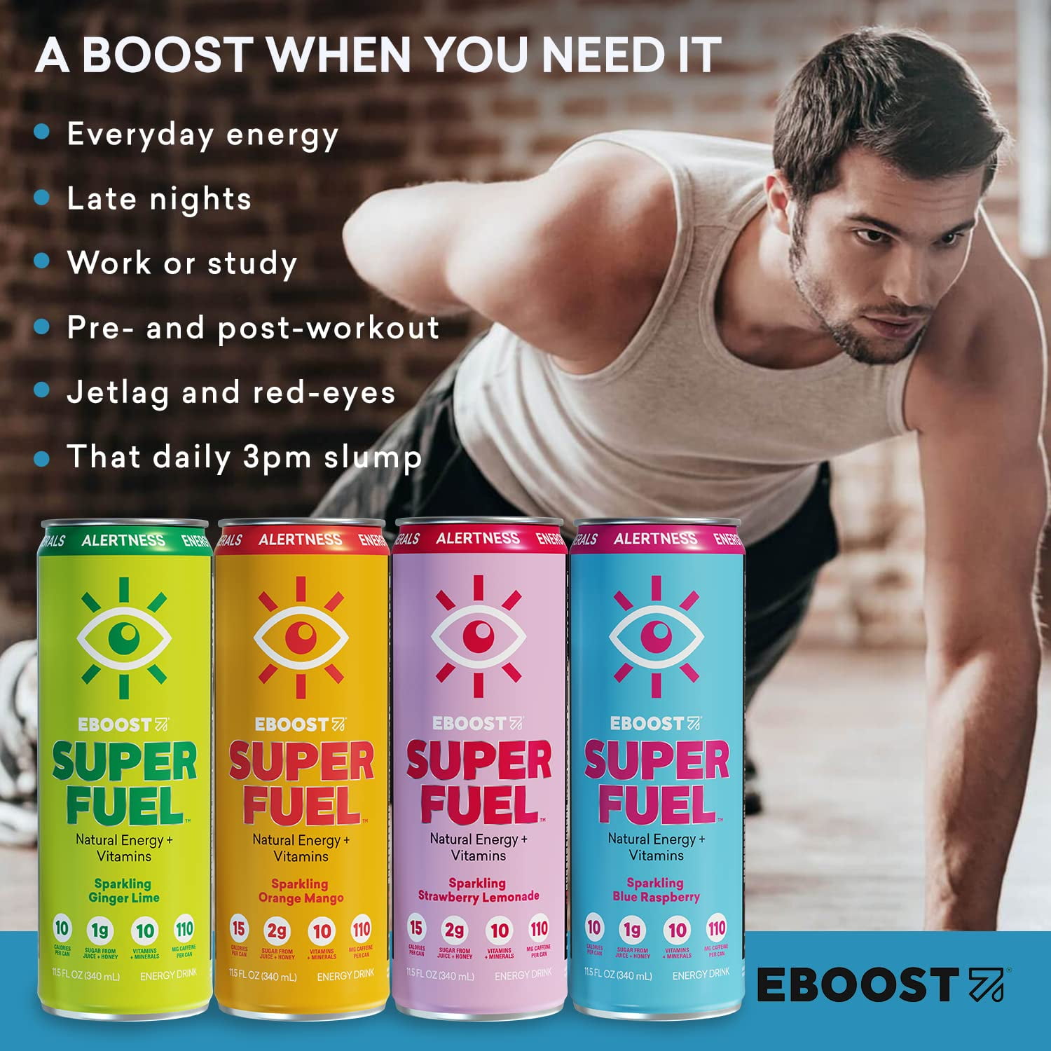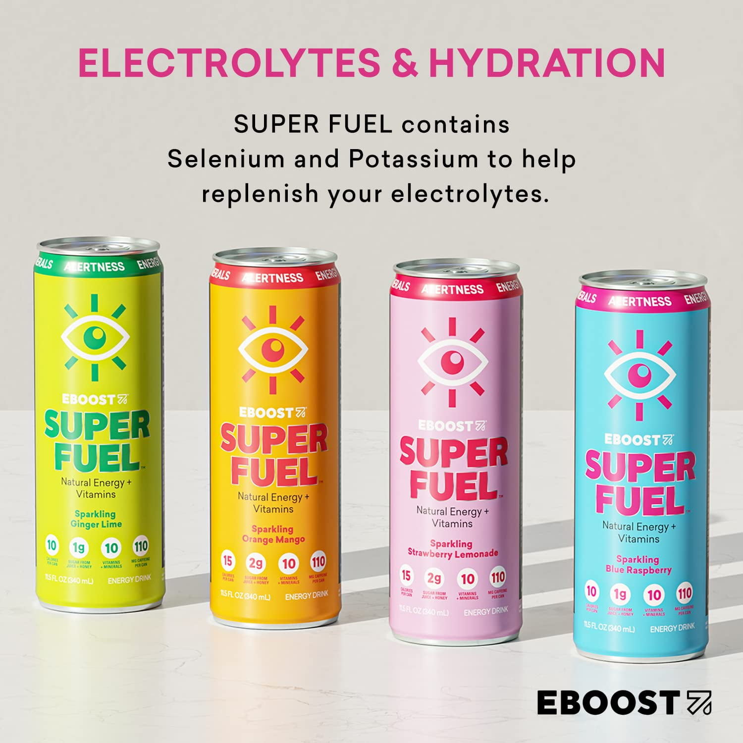 - Your Kick in a Can: SUPER FUEL is a natural energy drink like no other, fortified with natural caffeine, vitamins, minerals, nootropics, electrolytes and antioxidants. Perfect for: work/study, morning/afternoon pick-me-up, jet lag, before the gym or to replace coffee. This variety pack includes 3 Orange Mango, 3 Strawberry Lemonade, 3 Ginger Lime and 3 Blue Raspberry for a total of 12 cans (11.5 fl. Oz per can)