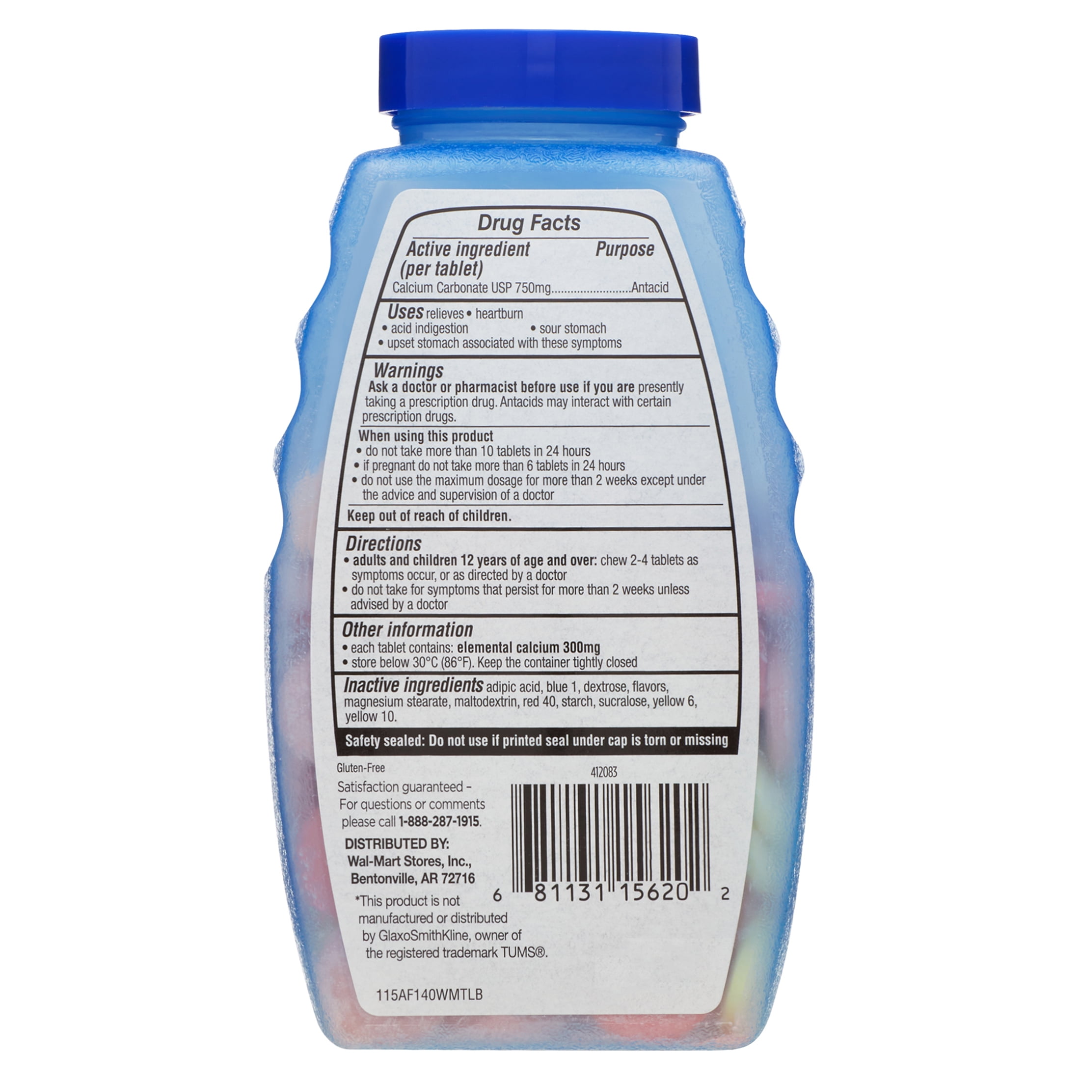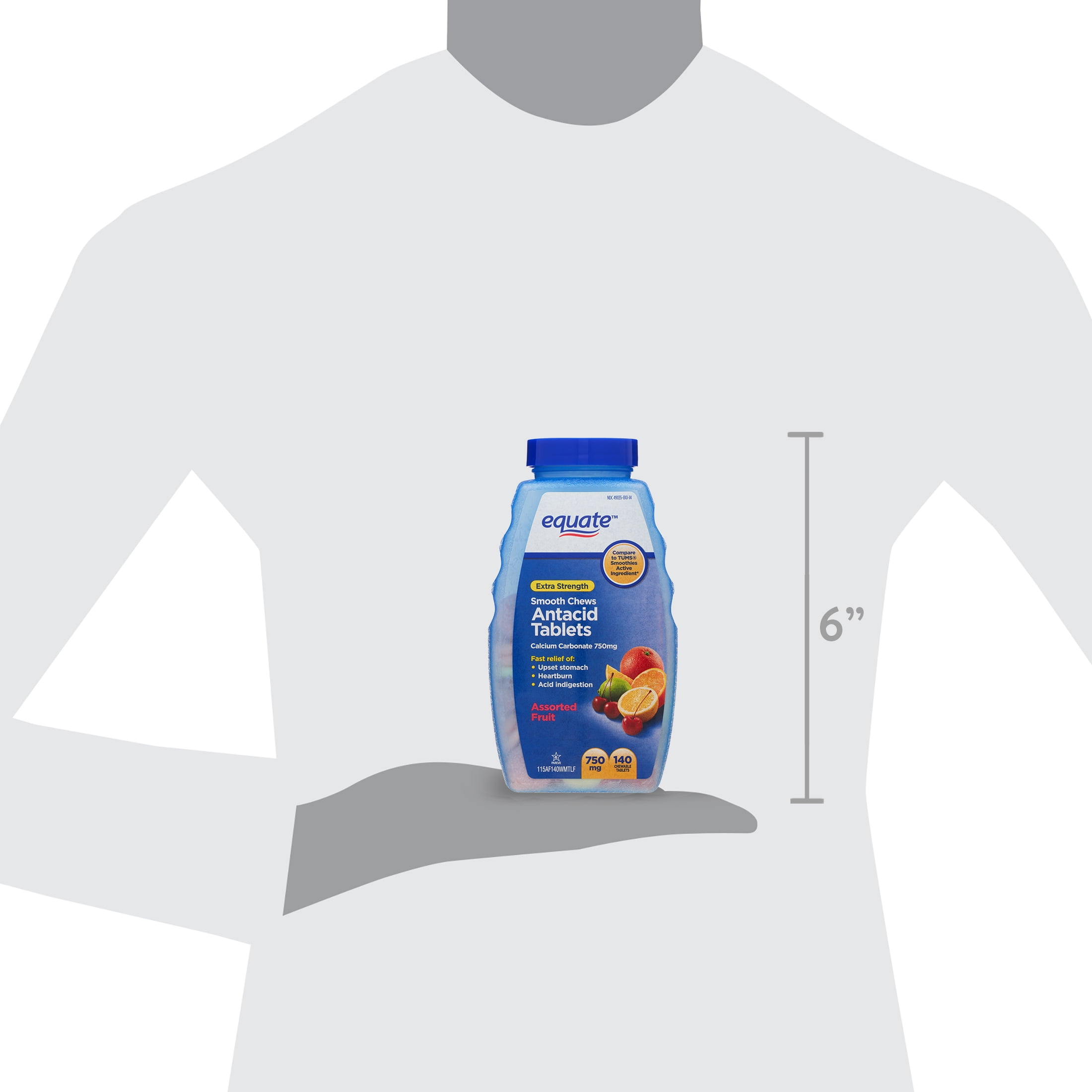Equate Extra Strength Smooth Chews Antacid Tablets help to relieve and prevent heartburn caused by certain foods and beverages. They help with heartburn associated with acid indigestion and sour stomach. Chew two to three tablets completely to help relieve symptoms when they happen. They can be taken before eating food or drinking beverages that cause heartburn. These tablets help to decrease the production of stomach acid giving you more freedom to eat what you want. Each bottle contains 140 tablets that contain 750 milligrams of calcium carbonate each. Compare to Tums Smoothies active ingredient. Equate Extra Strength Smooth Chews Antacid Tablets are the best choice to give you the freedom you deserve with food and beverages.