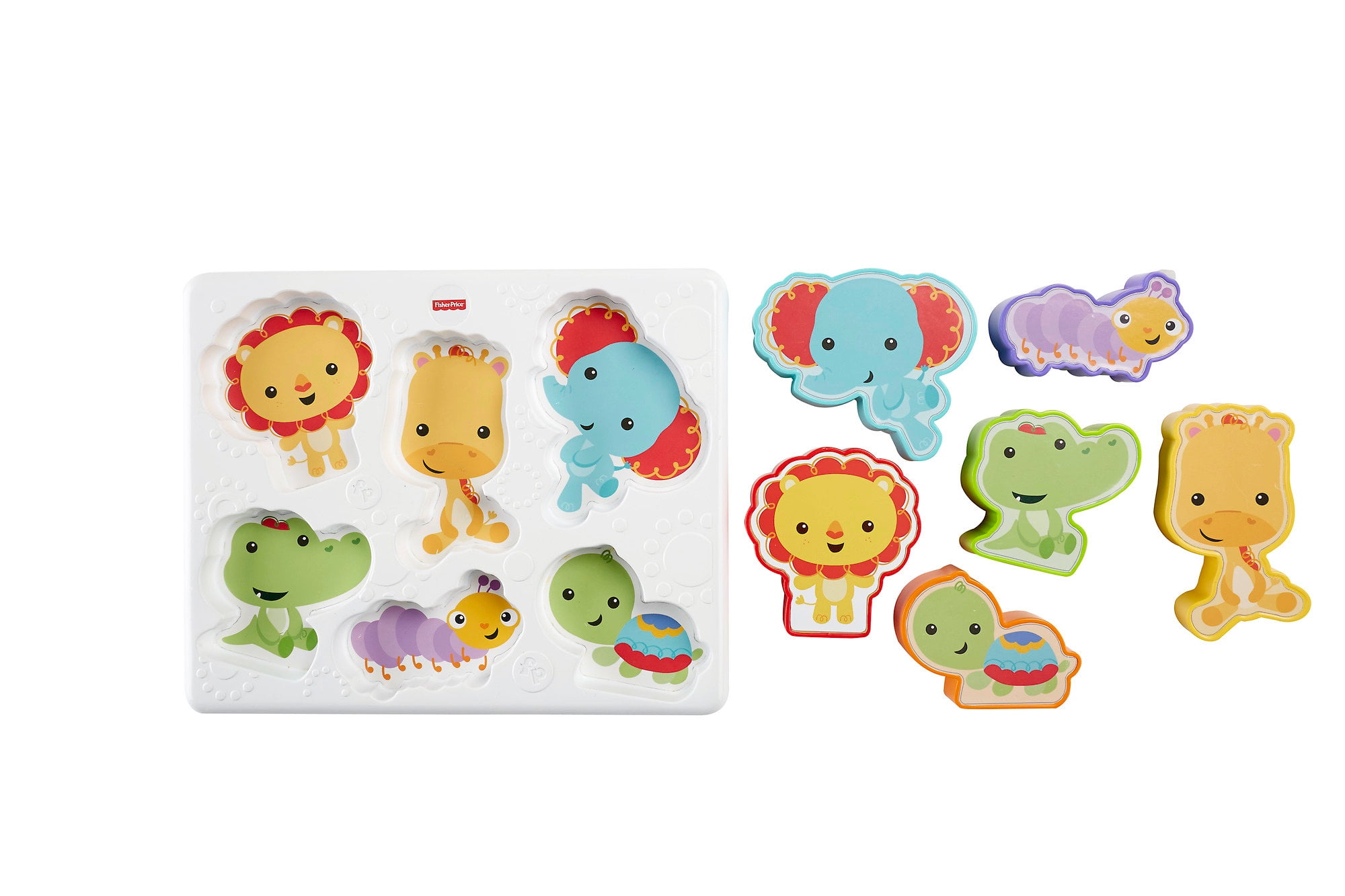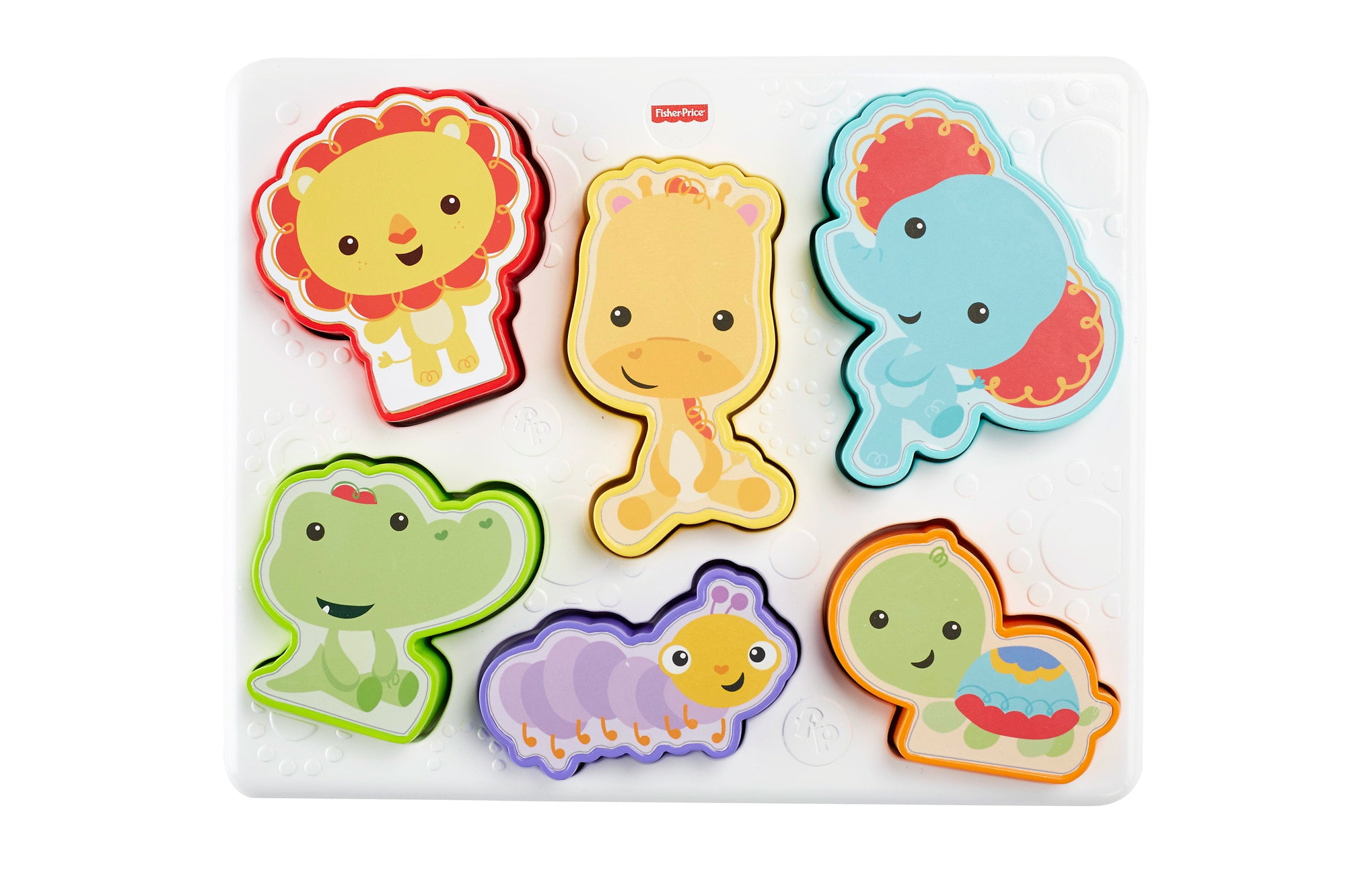 We like that these cute animal characters are on the chunky side. That makes it easy for little hands to grasp them, hold them, match them up and fit them into the picture-puzzle base! And they?re real stand-up characters, too, so baby can use them for fun figure play! The Fisher-Price Animal Friends Puzzle truly offers double the fun, with 2-in-1 play !