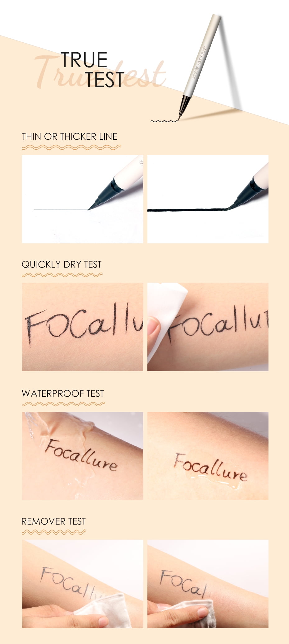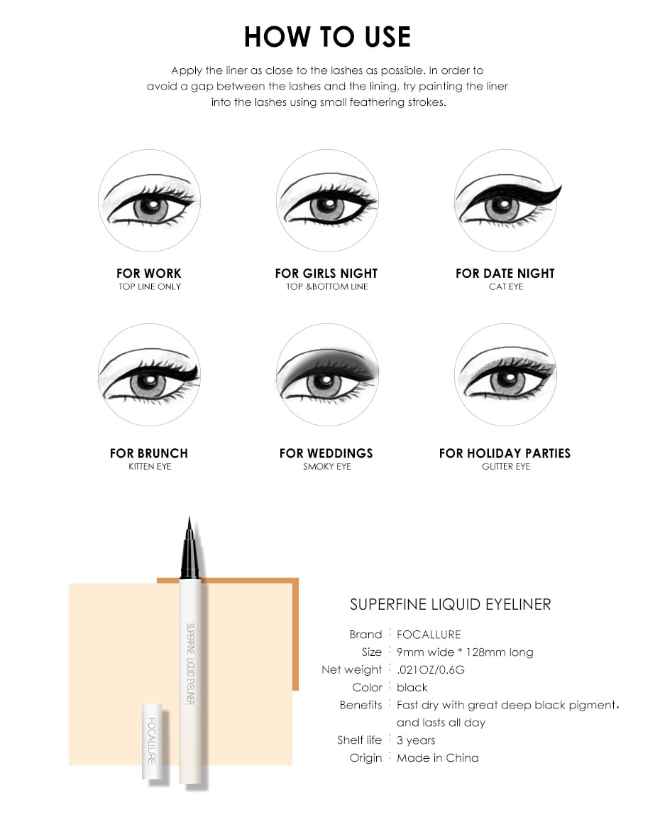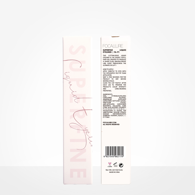 The FOCALLURE™ SUPERFINE is an ultra-fine felt tip liquid eyeliner that delivers intense pigmentation in one easy swipe. The creamy formula makes blending super easy and the formula dries down for long-lasting wear. The eyeliner pen is easy to use. The flexible tip glides on smoothly with intense pigmentation in one swipe without skipping or tugging. it won’t smudge, feather or run down! It is very user-friendly, and even makeup beginners can make use of it to draw perfect eyeliners. Just point the tip toward the inner corner of the eye and lay flat along the base of the lash line, as close to the lashes as possible. Glide from the inner to the outer corner of lash line in a smooth, even motion. That’s it!