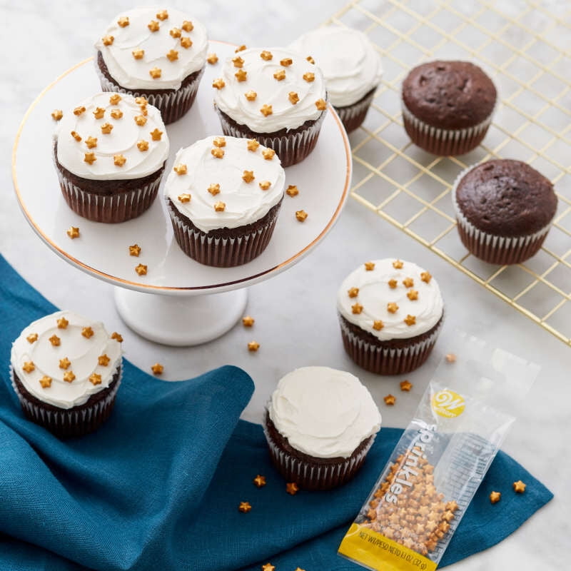 Add a glamorous touch to cupcakes, cake pops and other decorated treats with our shimmering candy star sprinkles. Use jimmies or sugars in contrasting colors for a festive display.SpecificationsStar-shaped sprinkles for topping cupcakes, cookies, brownies and moreColor: GoldNet weight: 1.1 oz. (32 g)Certified kosherMade in a facility that also processes soy and wheat. Shaped sprinkles not recommended for bakingAdd a glamorous touch to cupcakes, cake pops and other decorated treats with our shimmering candy star sprinkles. Use jimmies or sugars in contrasting colors for a festive display.SpecificationsStar-shaped sprinkles for topping cupcakes, cookies, brownies and moreColor: GoldNet weight: 1.1 oz. (32 g