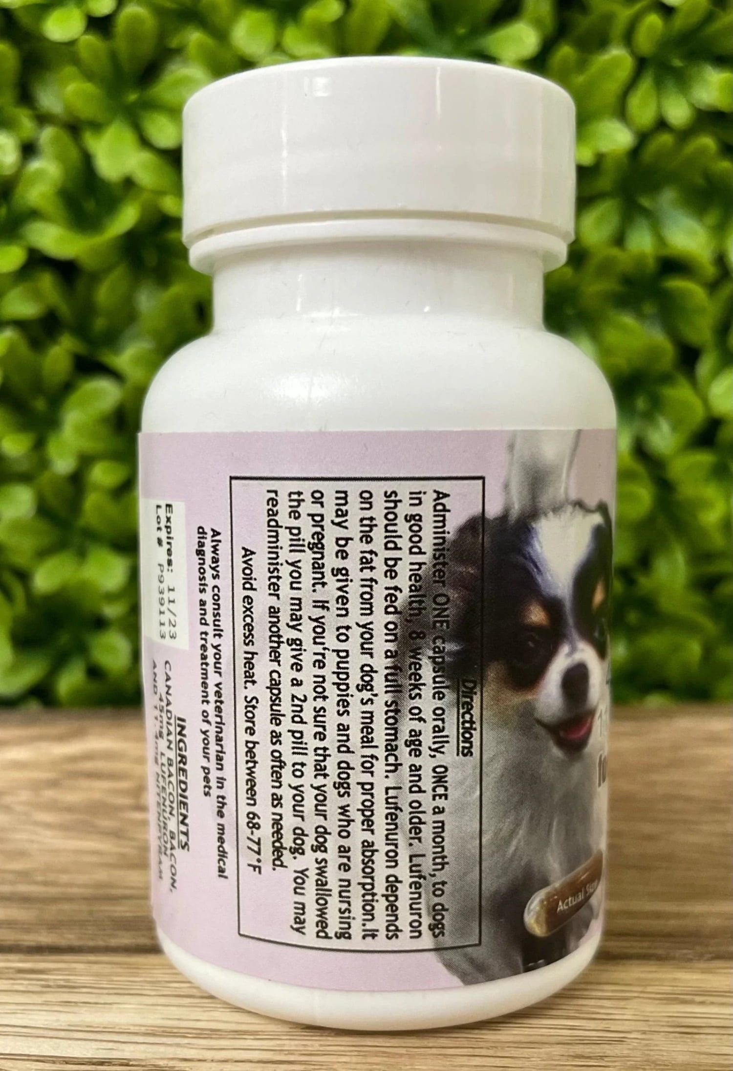 11.4mg of Nitenpyram and 45mg of USP grade Lufenuron were carefully blended with premium meat in a compact clear gelcap.