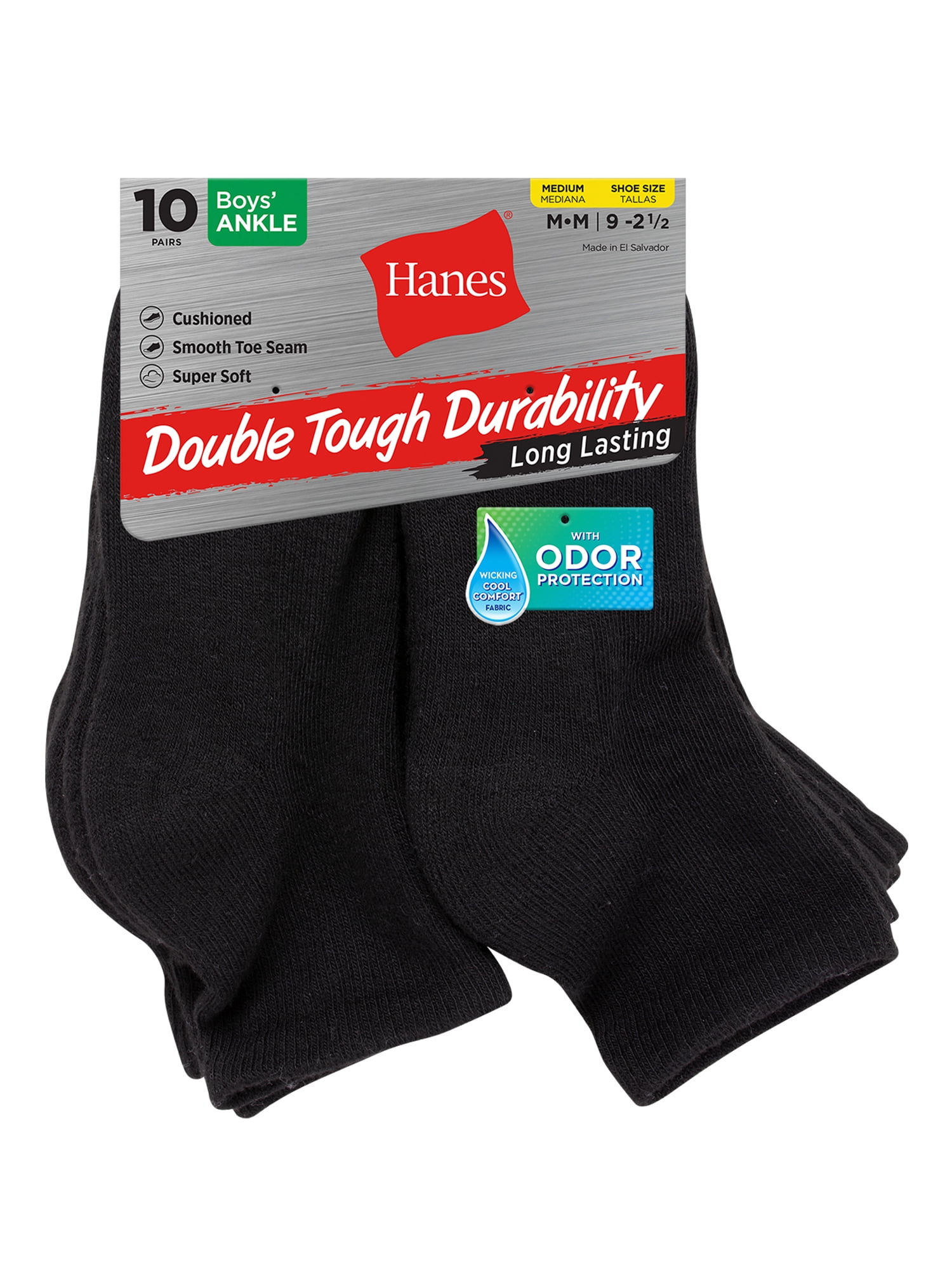 When boys play rough, you can count on the Hanes Boys’ cushion ankle socks. Double tough durability means boys will wear out before these socks do. Super soft, cushioned foot provides comfort in every step and our wicking cool comfort fabric helps feet stay dry. The ribbed knit ankle keeps socks from slipping down. Hanes odor control technology helps reduce unpleasant odors from his socks, keeping his feet fresh all day. The convenient, value-priced 10pk helps prevent those frantic, last minute searches for socks. And the EZ Sort sock matching system takes the guesswork out of laundry sorting. Hanes Boys Cushion Ankle Socks are just what boys need to keep their feet comfortable, protected and ready for adventure.