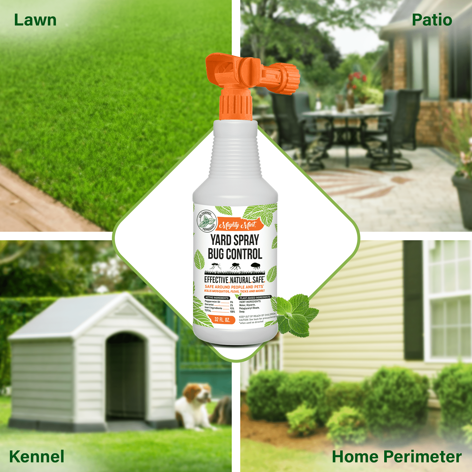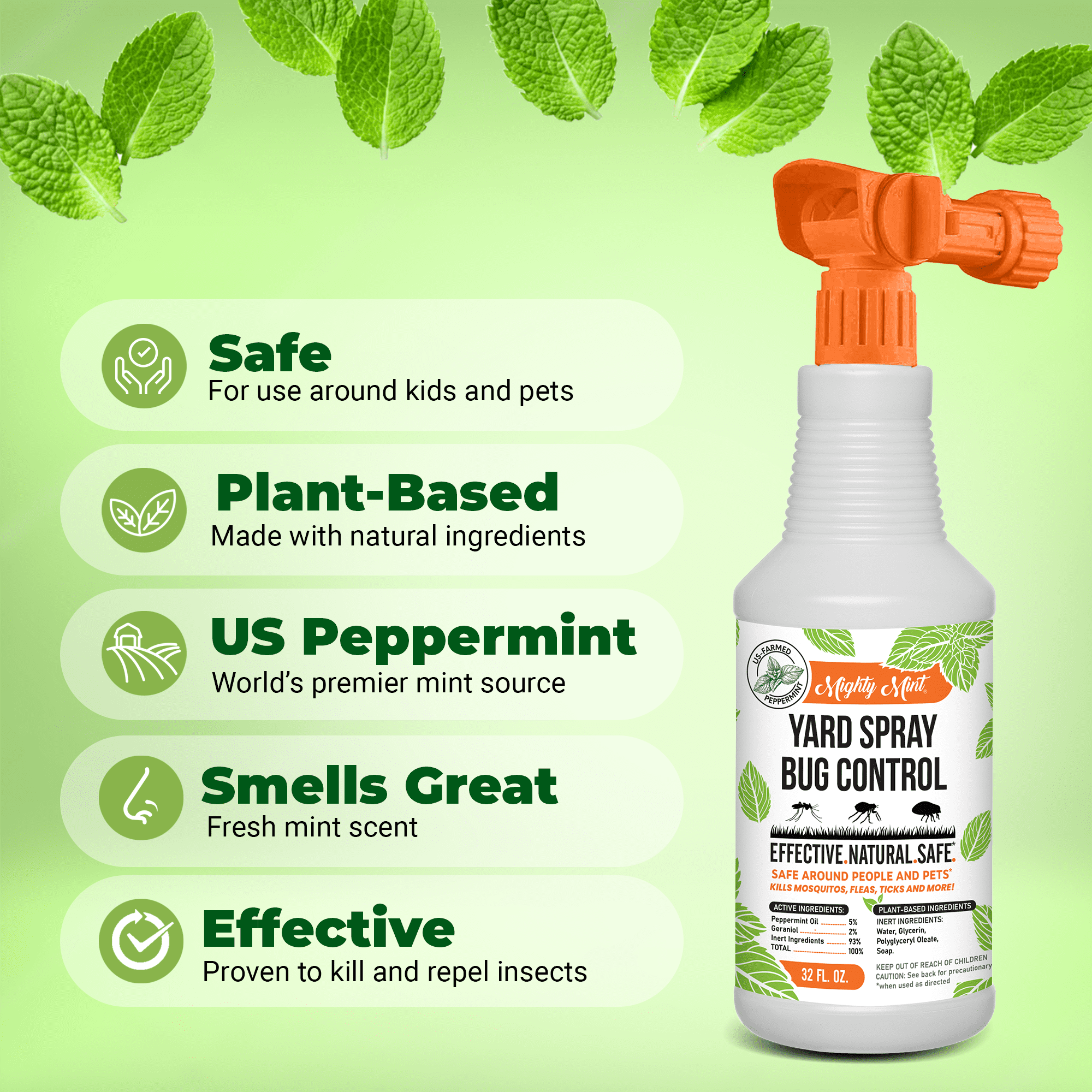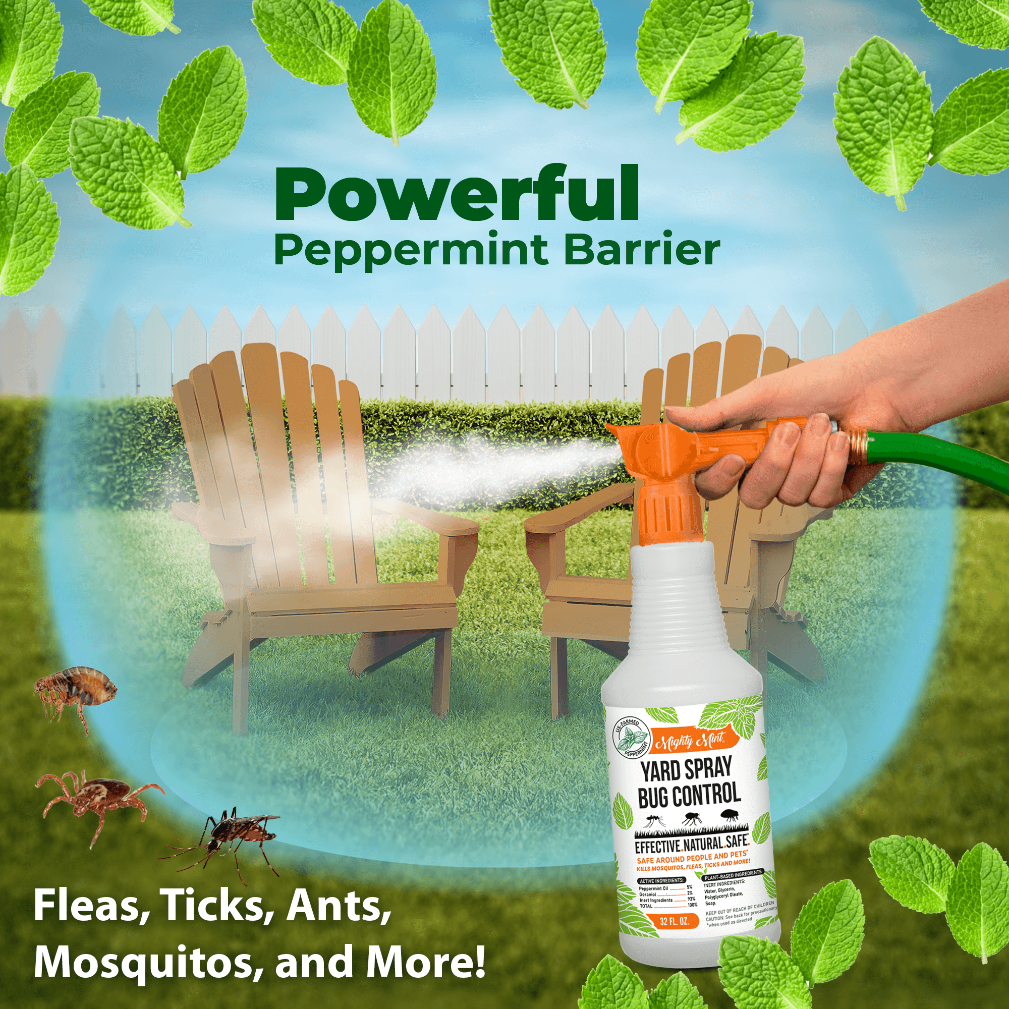 Mighty Mint Yard Spray Bug Control is an effective insect killer and repellent for outdoor living spaces. This yard spray controls mosquitoes, fleas, ticks, ants, and other pests. Powerful peppermint oil and other natural ingredients kill bugs on contact and create a protected area. It is easy to apply to backyards, lawns, patios, and pet areas using a standard garden hose.