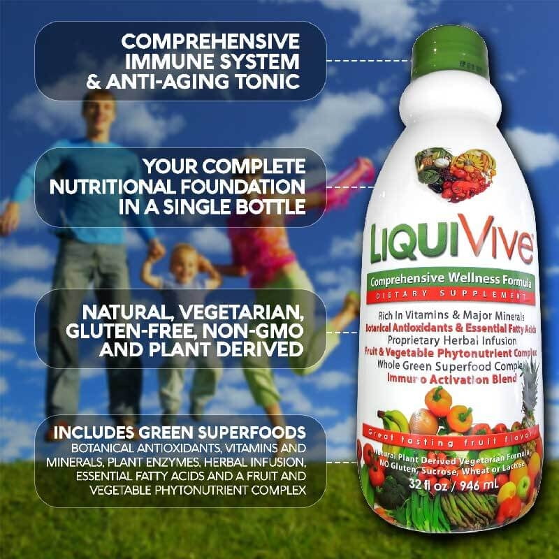 LiquiVive Comprehensive Liquid Nutritional Supplements combines a comprehensive blend of the highest quality vegetarian ingredients to create a potent boost of green super foods, antioxidants, multivitamins and minerals, enzymes, herbs, essential fatty acids, and fruits and vegetables. It is always best to get all of the nutrition you need to be healthy from your diet. Unfortunately, most people do not have the time, discipline or wherewithal to do so, especially with respect to natural, whole foods. This is where LiquiVive come in. It makes it easy for you to get perfectly balanced nutrition, even if your diet is less than perfectly balanced. This does not give you license to eat poorly, nor does it replace a balanced diet. But it does give you the peace of mind knowing that you are filling in the nutritional gaps you may be experiencing from a less than optimal diet. How important is having complete nutrition in your diet?…"Nearly all disease can be traced to a nutritional deficiency". – Dr. Linus Pauling, Two-Time Nobel Prize Winner. LiquiVive is meant to fill in all the nutritional gaps that you experience on a daily basis by not consuming a perfect diet. Just one ounce of LiquiVive Liquid Vitamins per day acts as your nutritional foundation, floods your body with anti-aging and energy boosting ingredients, gives you the highest possible bodily absorption, and helps you keep your immune system running in tip-top shape by helping you to avoid health and energy and health robbing nutritional deficiencies. Take LiquiVive and boost your immune system, increase your natural energy levels, and start feeling the energy & vitality of your youth again. Experience potent natural energy and maintain vibrant health easily with this amazing anti-aging immune system booster.LiquiVive Liquid Vitamins Nutritional Supplements. Best Anti-Aging Whole Food Daily Multivitamin Dietary Supplement. 32 fl oz.