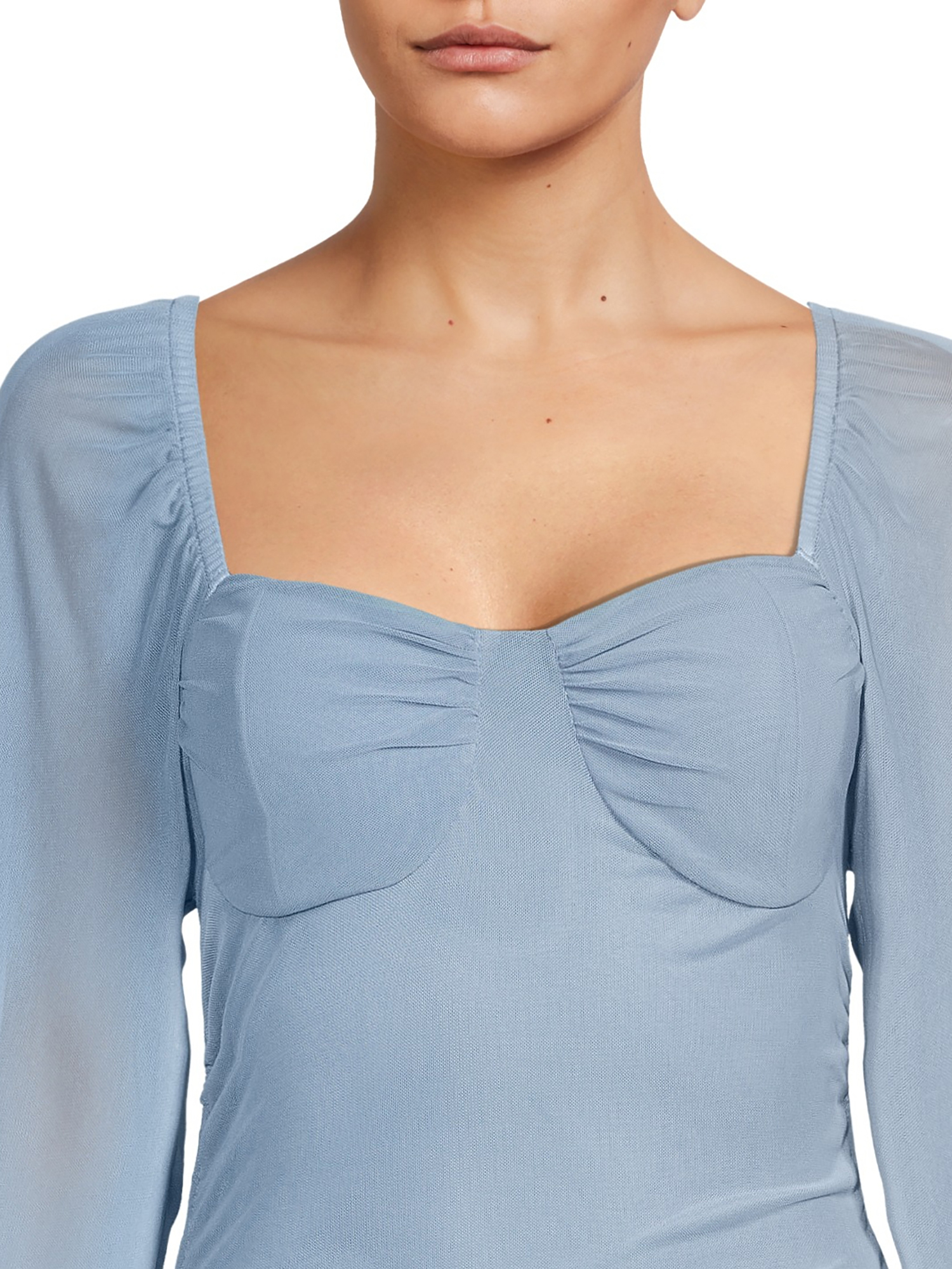 - Features: Sweetheart neckline; ruched mesh overlay with adjustable sides; sheer sleeves; fully lined; non-removable foam cups