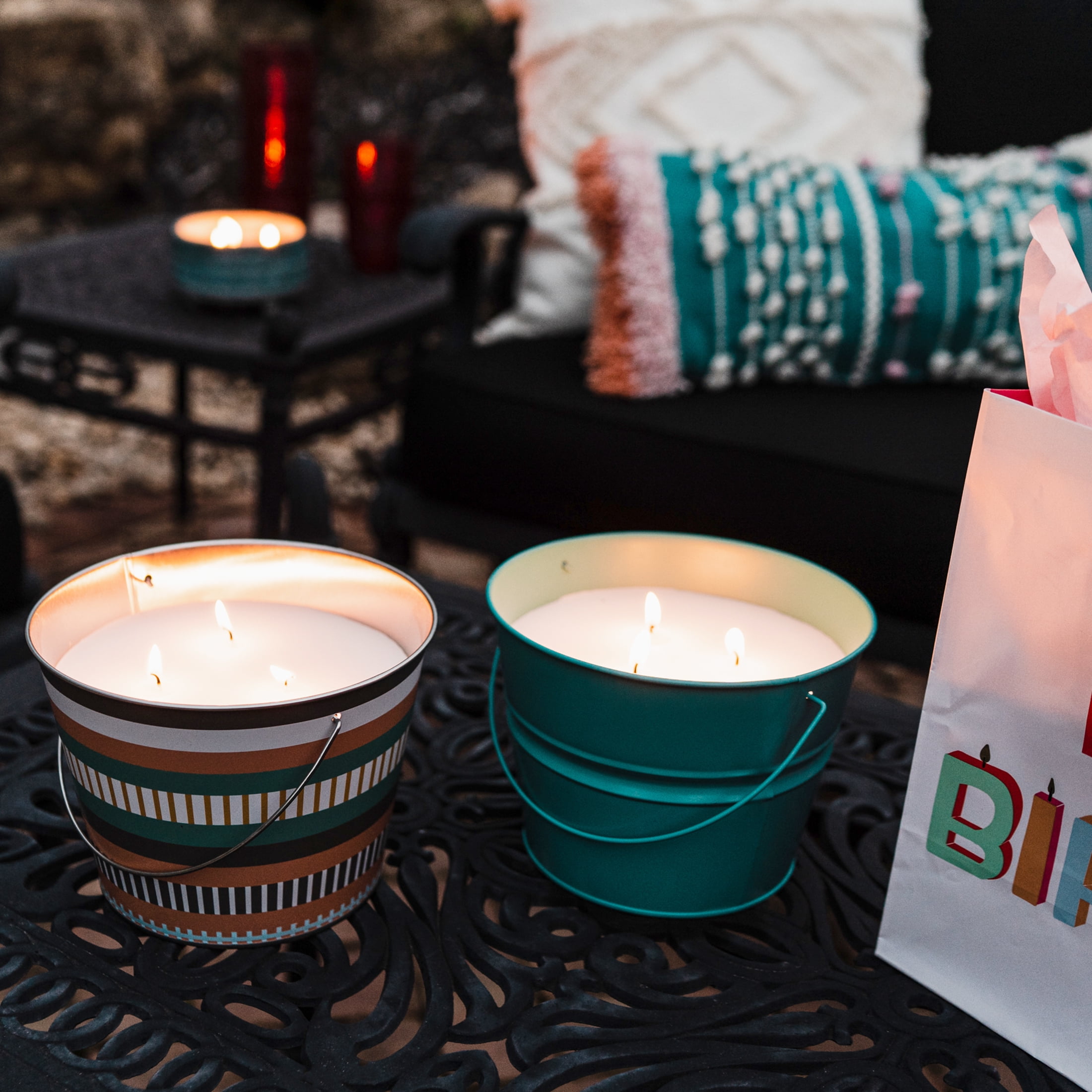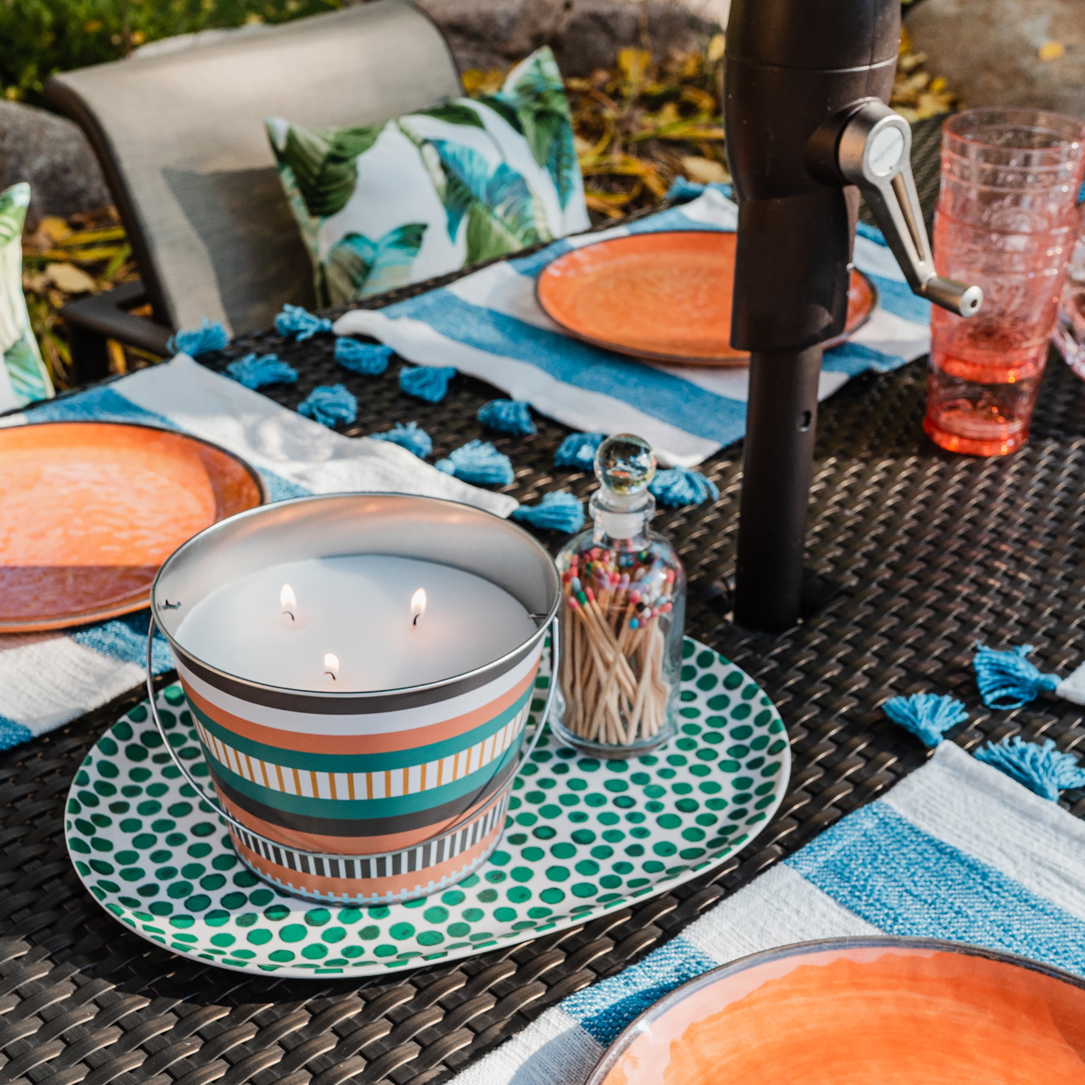 Keep mosquitoes away with the Mainstays 30-Ounce, 3-Wick Striped Bucket Outside Citronella Candle, Multi-Color! Citronella oil acts as a natural mosquito repellent. This bright colored 7.1-inch metal bucket adds a fun pop to your patio with it’s striped pattern. This 30-ounce candle burns for up to 50 hours, and the three wicks illuminate your yard with candlelight. Take this citronella bucket candle with you on your next picnic or camping trip, the handle and plastic lid make it perfect for traveling! For best results, place several Mainstays citronella candles around the area where people will gather to create a perimeter against mosquitoes. With its natural repellency and functional design, the Mainstays 30-Ounce, 3-Wick Striped Bucket Outside Citronella Candle will bring comfort to any outdoor space.