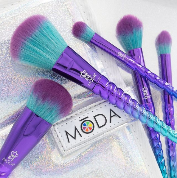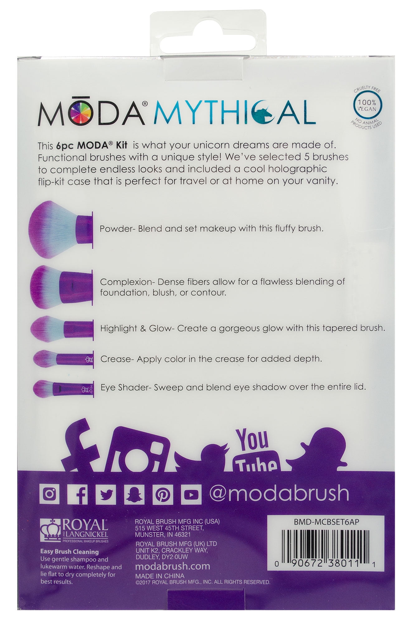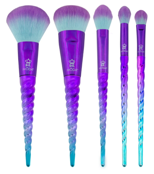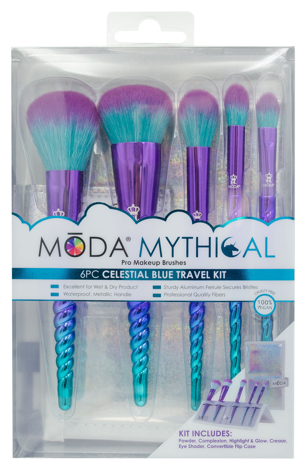Moda Mythical Celestial Blue Travel Sized Full Face 6pc Makeup Brush Set is what unicorn dreams are made of – functional brushes with a unique style! We’ve selected 5 two toned brushes to complete endless looks. It also includes a flip case that is perfect for taking your beauty on the road! Moda Brushes combine vibrant, fun brush styles for a beautifully bold look.