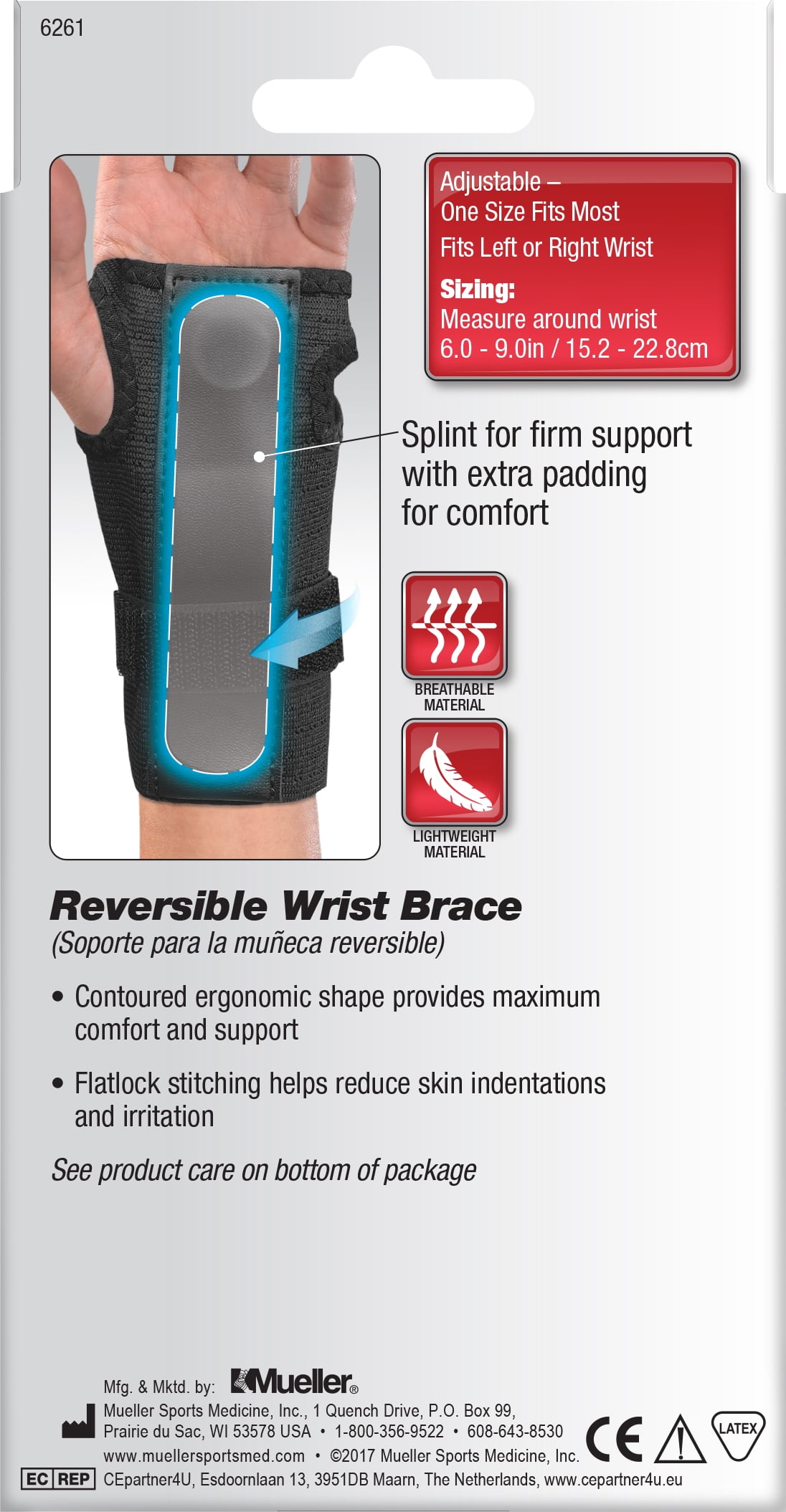 Get the support you need with this Mueller Sport Care Reversible Wrist Brace. Its unique, adjustable and reversible design is ideal for addressing symptoms associated with carpal tunnel syndrome. Inside of this package you will find one Mueller wrist brace with a removable splint for firm support and extra padding for comfort. With this item you will enjoy maximum support and protection throughout the day and even at night while you are sleeping.