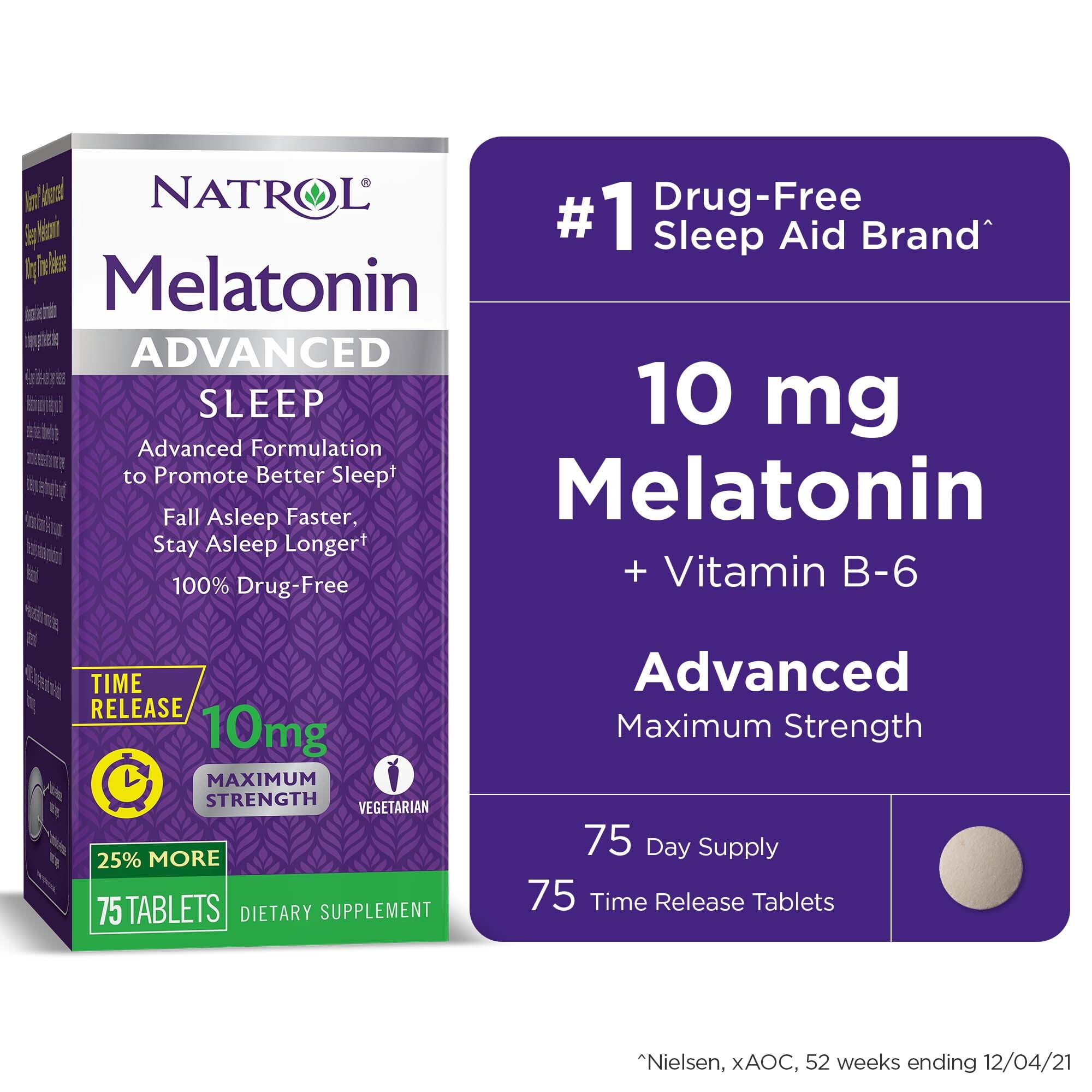 Natrol Advanced Sleep Melatonin 10mg and Vitamin B-6, Sleep Support, Maximum Strength, Time Release Tablets, 75ct