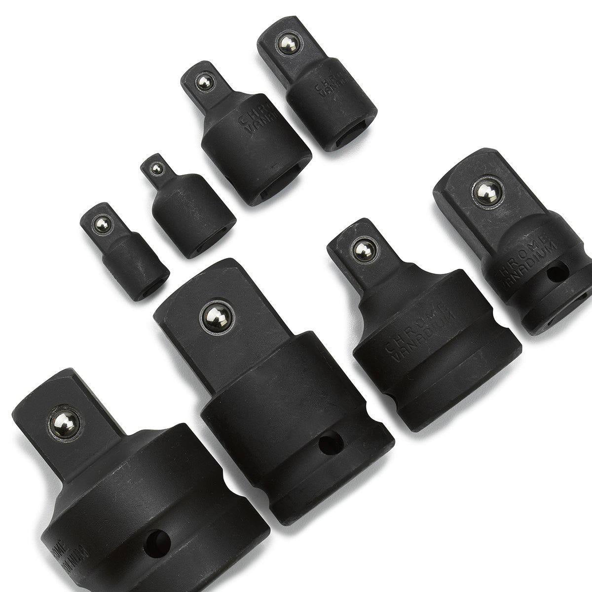 Durable 8-piece impact socket adapter and reducer set. These tools adapt to the situation on the fly to get it done. They create replacements for lost or broken sockets, expand incomplete socket sets, and Allows greater flexibility for all sockets and drive tools. Ball detent securely holds sockets on the coupler. Made of the highest quality chrome vanadium steel, each piece undergoes a precise heat treating process, hardening and strengthening it for use with impact wrenches and drivers. Set Includes: 4-pc. Reducers: 3/4 in. (M) x 1 in. (F), 1/2 in. (M) x 3/4 in. (F), 3/8 in. (M) x 1/2 in. (F), 1/4 in. (M) x 3/8 in. (F); 4-pc. Adapters: 1 in. (M) x 3/4 in. (F), 3/4 in. (M) x 1/2 in. (F), 1/2 in. (M) x 3/8 in. (F), 3/8 in. (M) x 1/4 in. (F)