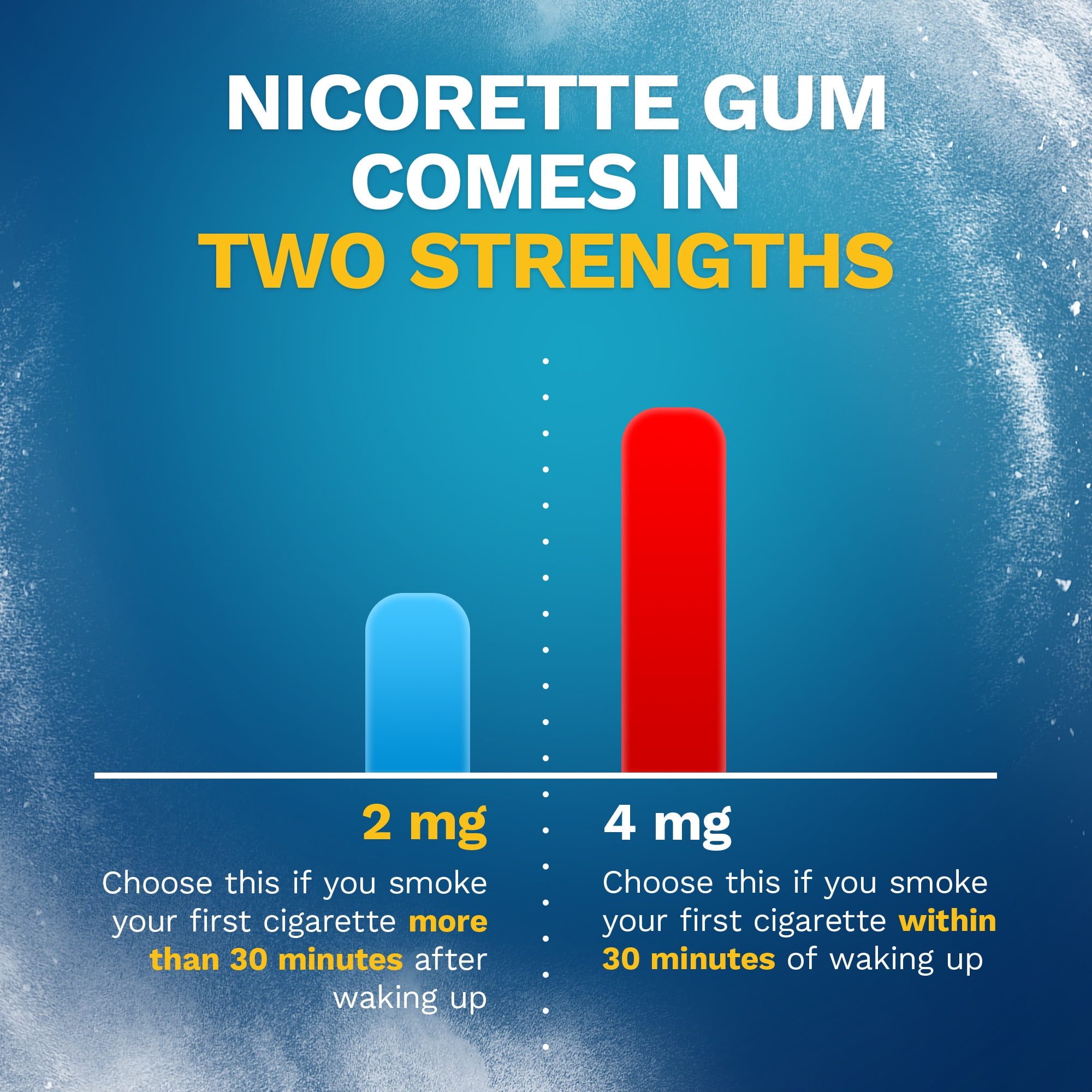 Enjoy a bold and refreshing taste as you gradually kick your smoking habit with Nicorette Nicotine Gum to Quit Smoking. Made with a special formula that releases a small, therapeutic dose of nicotine, this smoking cessation gum is slowly absorbed by the body, allowing you to manage your daily nicotine intake while soothing the cravings, anxiety, frustration, depressed mood, irritability and restlessness associated with quitting smoking. This double-coated nicotine gum is a stop smoking aid that offers a long-lasting burst of White Ice Mint flavor to help you stick with your quit, giving you the choice to chew a second piece within the hour if you feel strong or frequent cravings. This 2mg mint nicotine gum is a great OTC nicotine replacement therapy If you smoke your first cigarette within 30 minutes of waking up. Complete a 12-week quit program with behavioral support to increase your chances of success. Take control of your quit with Nicorette White Ice Mint Nicotine Gum.
