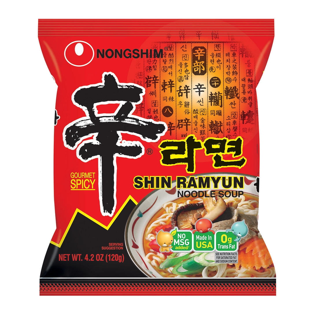 Nong Shim Ramyun Spicy Ramen Beef New Noodle Soup 16 Pk. 4.2 oz. Nong Shim Spicy Noodle Soup is a delicious Ramen Noodle Soup experience, made even better by its affordable price. Nongshim Shin Ramyun is authentic Korean food that you can enjoy at home or on the go, even on a budget. If you prefer bold and spicy flavors, try our flagship flavor, Shin Ramyun. The soft and chewy noodle combined with the spicy beef broth creates the perfect recipe that will please any palate. As soon as it was released on the market, Shin Ramyun became an instant hit among consumers who especially liked bold flavors.