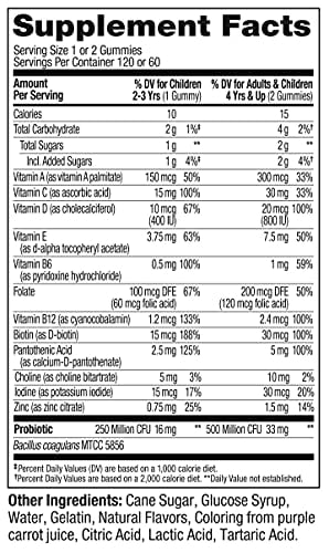 - THE GOODS INSIDE: This kids vitamin delivers a blend of Vitamins A, C, D, E, Bs and Zinc plus a super dose of probiotics (the good bugs) to help support healthy belly bacteria and a strong immune system*