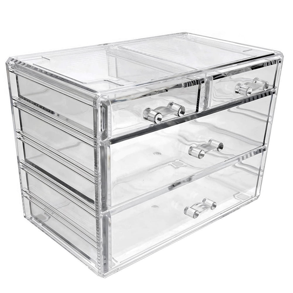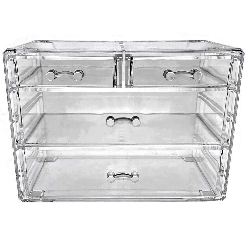 - COSMETIC AND MAKEUP STORAGE DISPLAY CASE (2 LARGE, 2 SMALL DRAWERS, CLEAR) – Allows you to organize all your cosmetics, makeup and accessories into a stunning customized beauty center. Measures 9.3" x 5.8" x 6.7" tall.