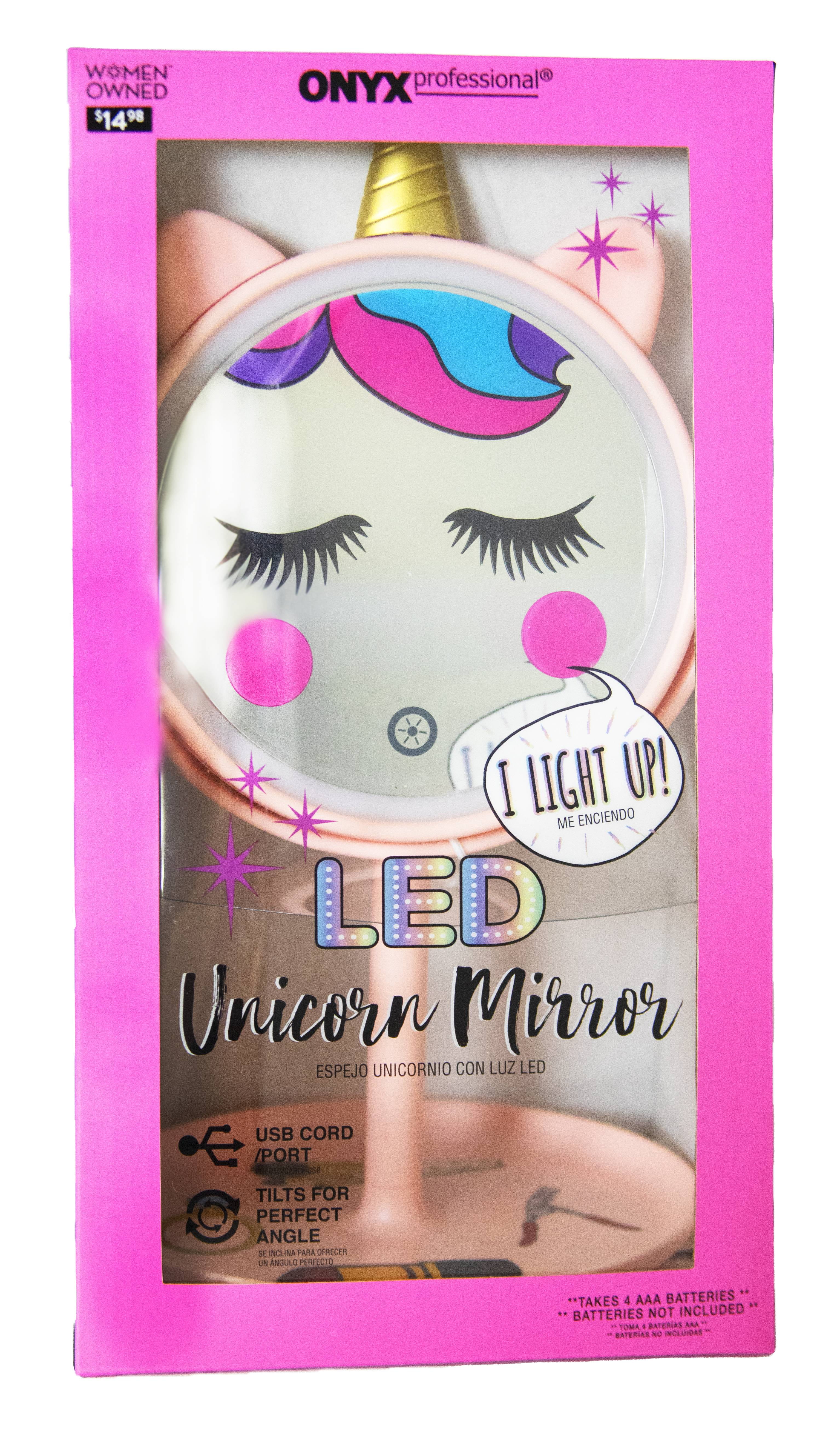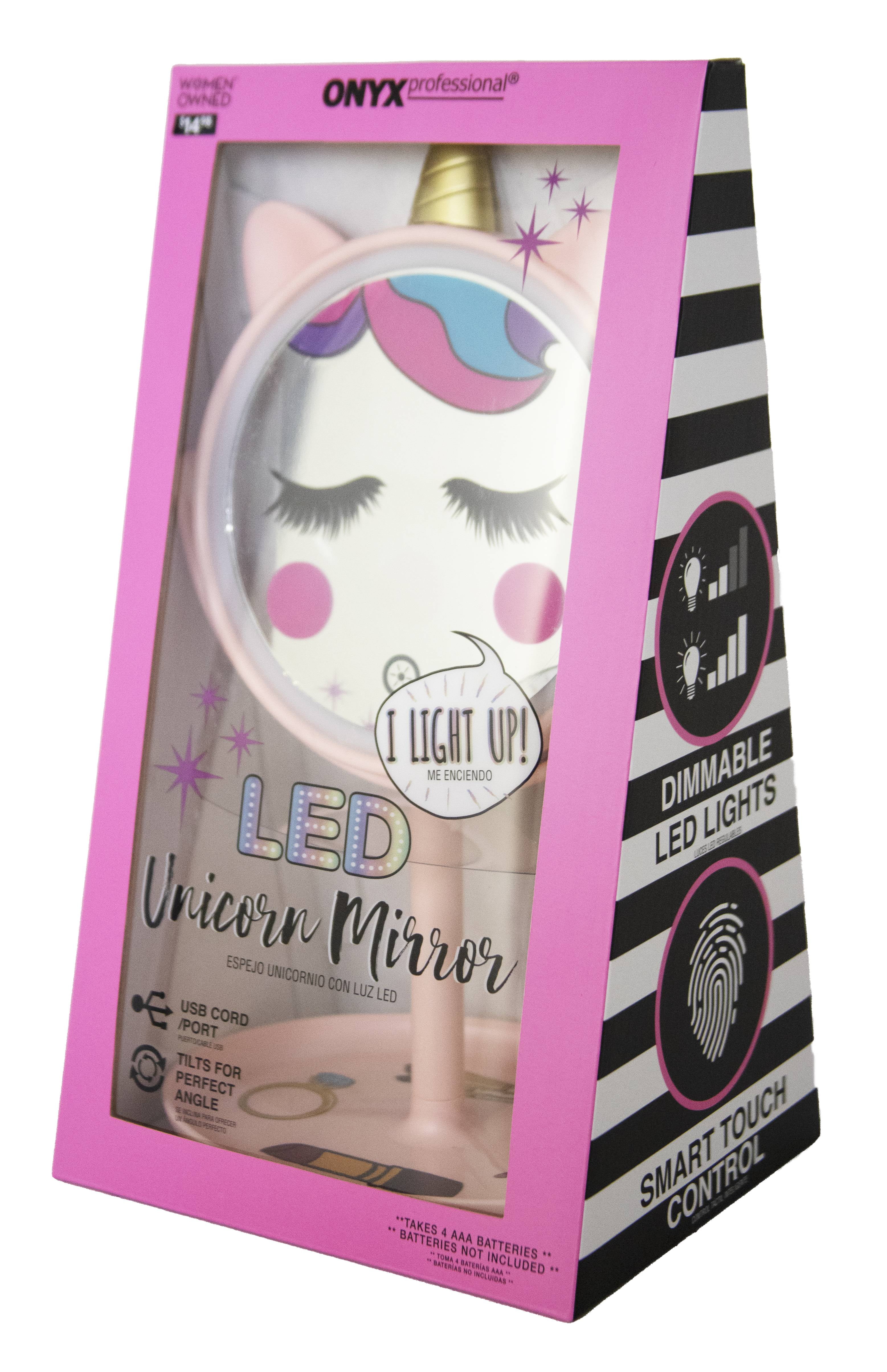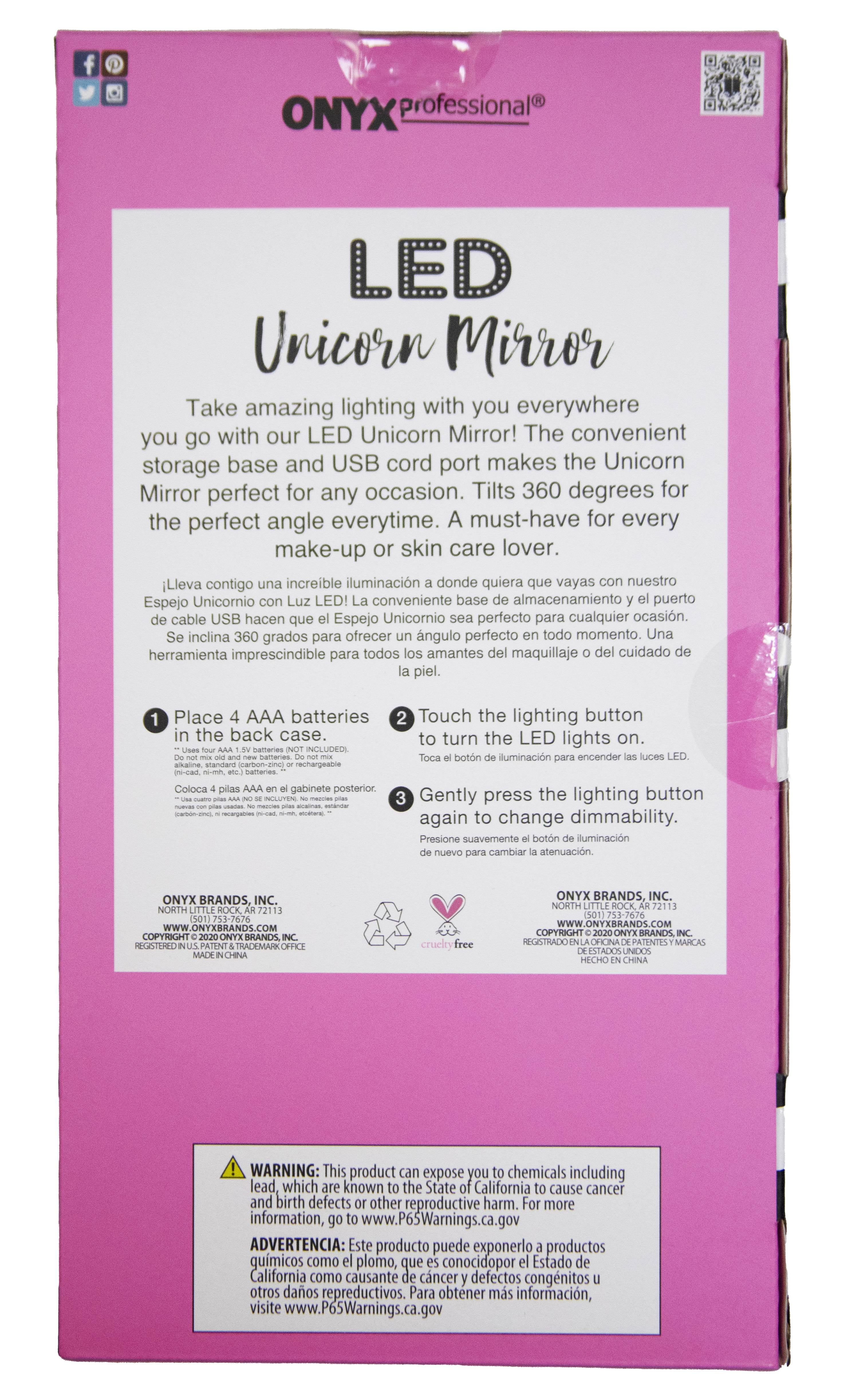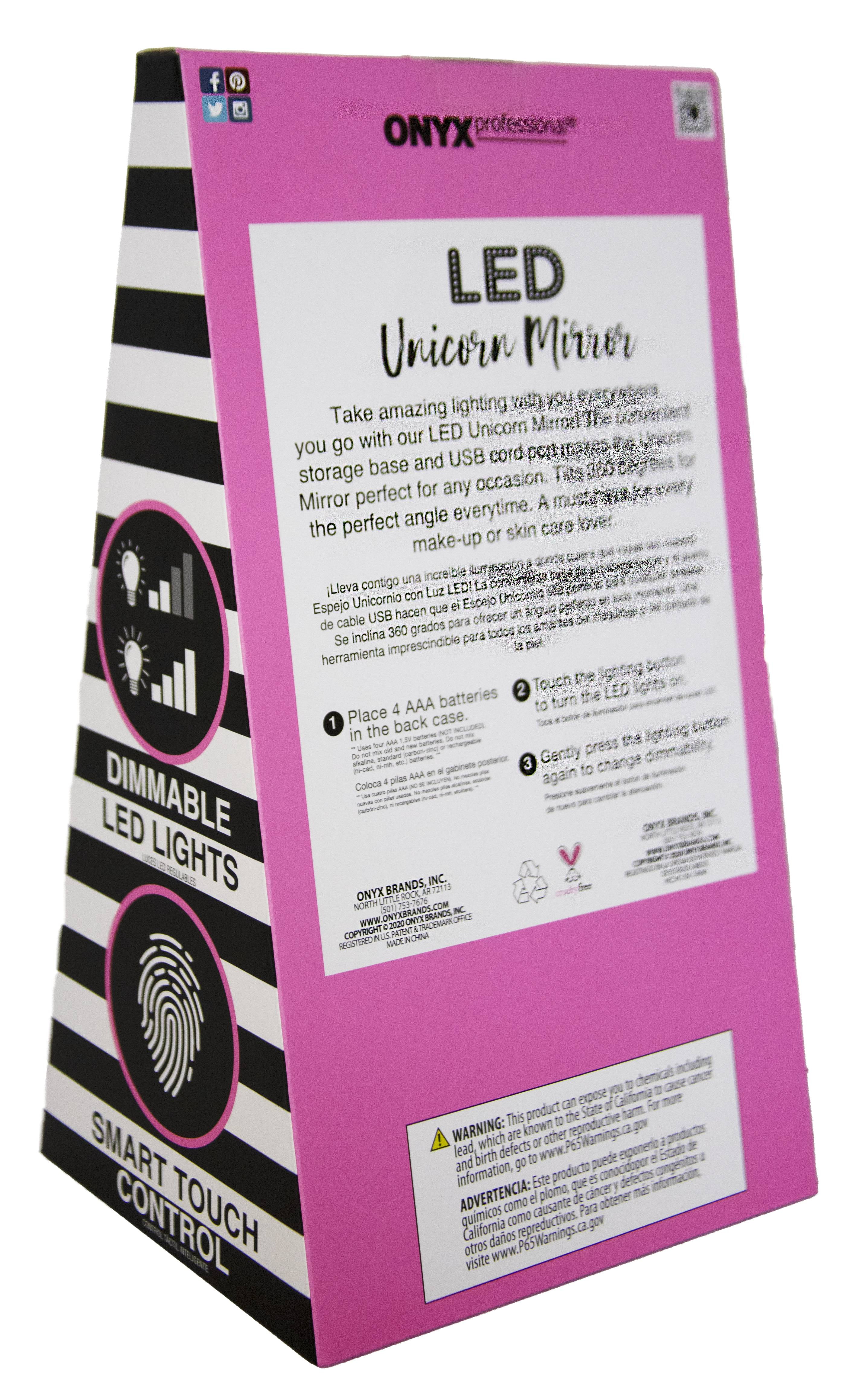 Reflect your playful side with the adorable Onyx Professional Freestanding Multicolor Unicorn Mirror. A cute addition to a tween vanity or dorm room, this mirror is small enough for tight spaces and cute enough to make a true style statement. Lightweight and portable, it includes a handy storage base for vanity tools, jewelry, and hair accessories, keeping them in easy reach, and the mirror’s 180-degree rotation helps you find the perfect angle. The super bright LED ring light features an easy-to-use smart button control on the front that turns the mirror "on" with a simple touch and allows you to dim or brighten the lights as well. And before using your mirror, don’t forget to remove the protective film on the mirror surface. The Onyx Professional Unicorn Mirror can be powered by a 3 feet long micro USB cord (included) or 4 AAA batteries (not included), and its perfect size and collapsible design make it your personal in-home or on-the-go partner!