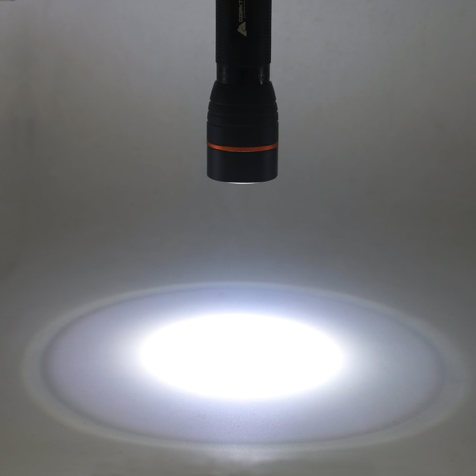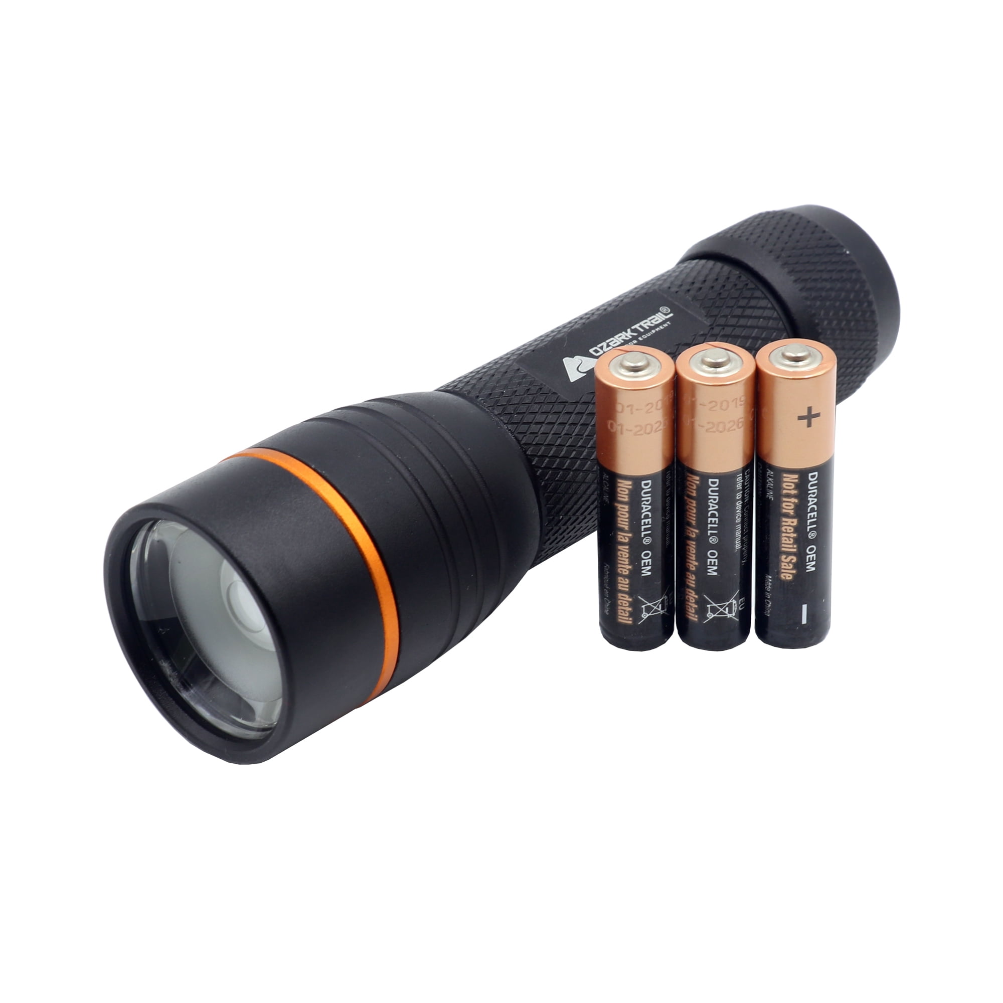 Take on the dark and hard-to-see places with the Ozark Trail Flashlight. This powerful flashlight offers 200 lumens of light to help you find your way. Ideal for outdoor spaces, camping and other low-light areas, this convenient flashlight can help you find your way and shine a spotlight on what you are looking for. Tough aluminum casing helps protect your flashlight during falls and in the elements. Three modes of light fit your needs with a high, low and flash setting. The slide focus control adjusts these settings with a comfortable grip. A portable design makes this on-the-go flashlight easy for storing in compact spaces, ready for your car or backpack. Durable and efficient LED light bulbs provide a lasting glow. LED bulbs stand up to the test of time and last longer without producing excess heat, so you can rely on this flashlight time and time again. The Ozark Trail Flashlight runs on three low cost AAA batteries, included for your convenience. With tough materials built to last, you can turn to your trusty Ozark Trail Flashlight to shine in the dark.