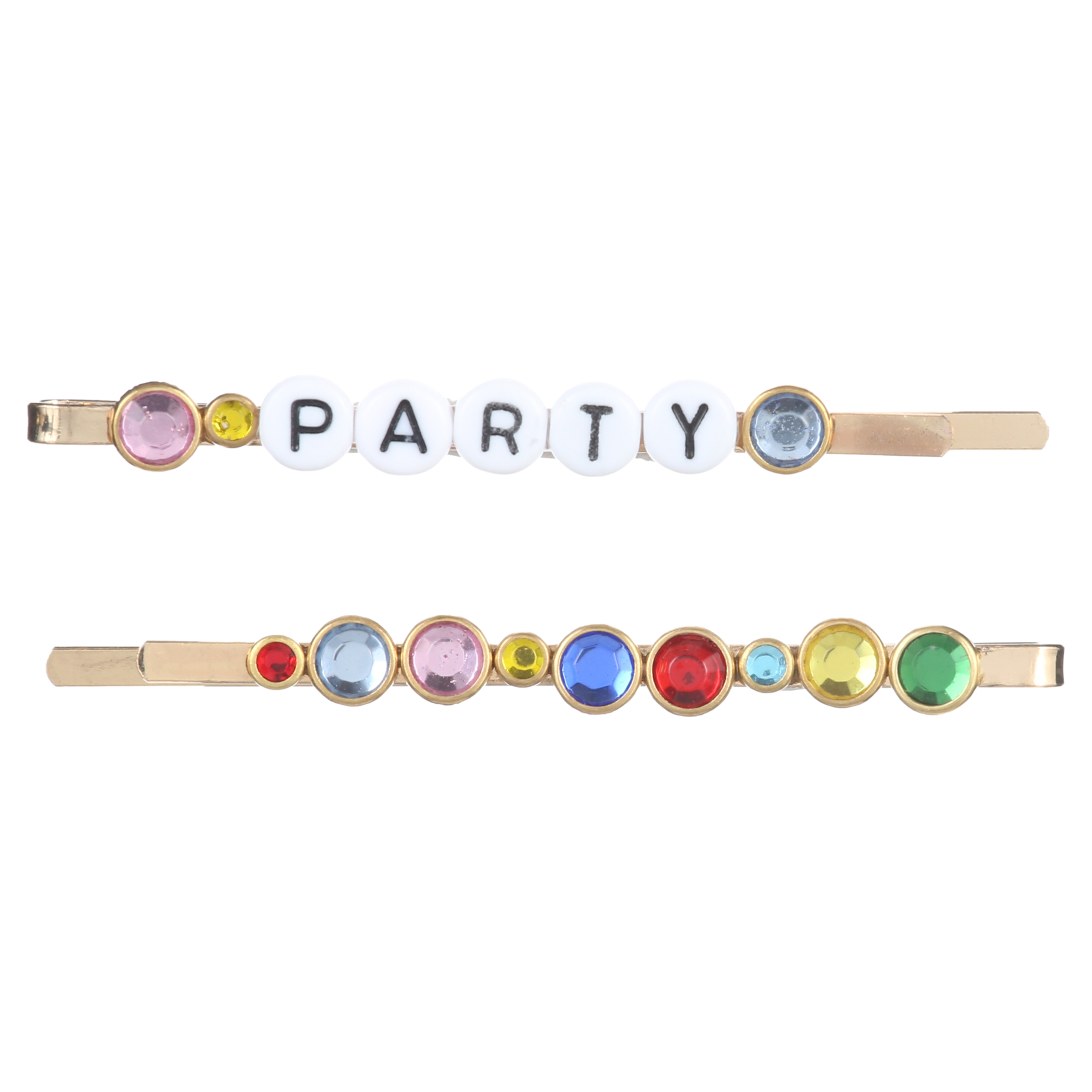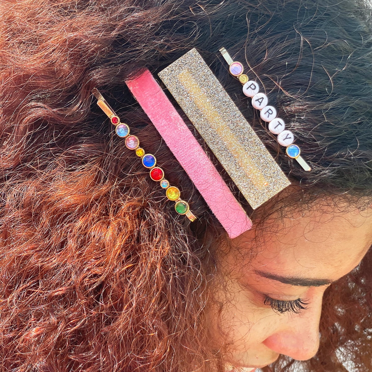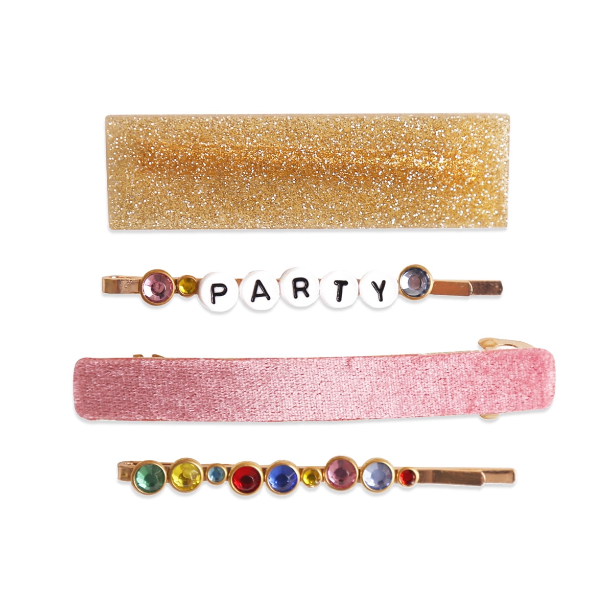 Prepare to mix-n-mingle thanks to this set of four clips! The mixed materials and gorgeous gems are designed to be bright and make anyone stand out in a crowd. Layer them up or wear them as a statement piece to dress up any kind of outfit!