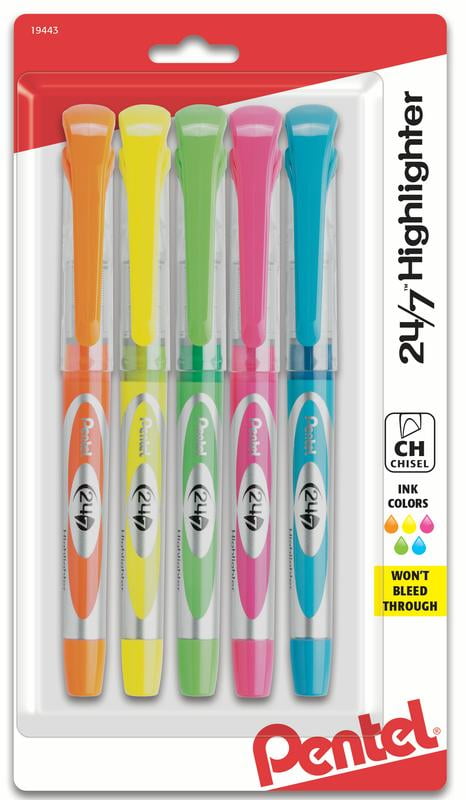 Pentel 24/7 Liquid Highlighter, Chisel Tip, Assorted Ink (F/G/P/K/S), 5-Pk