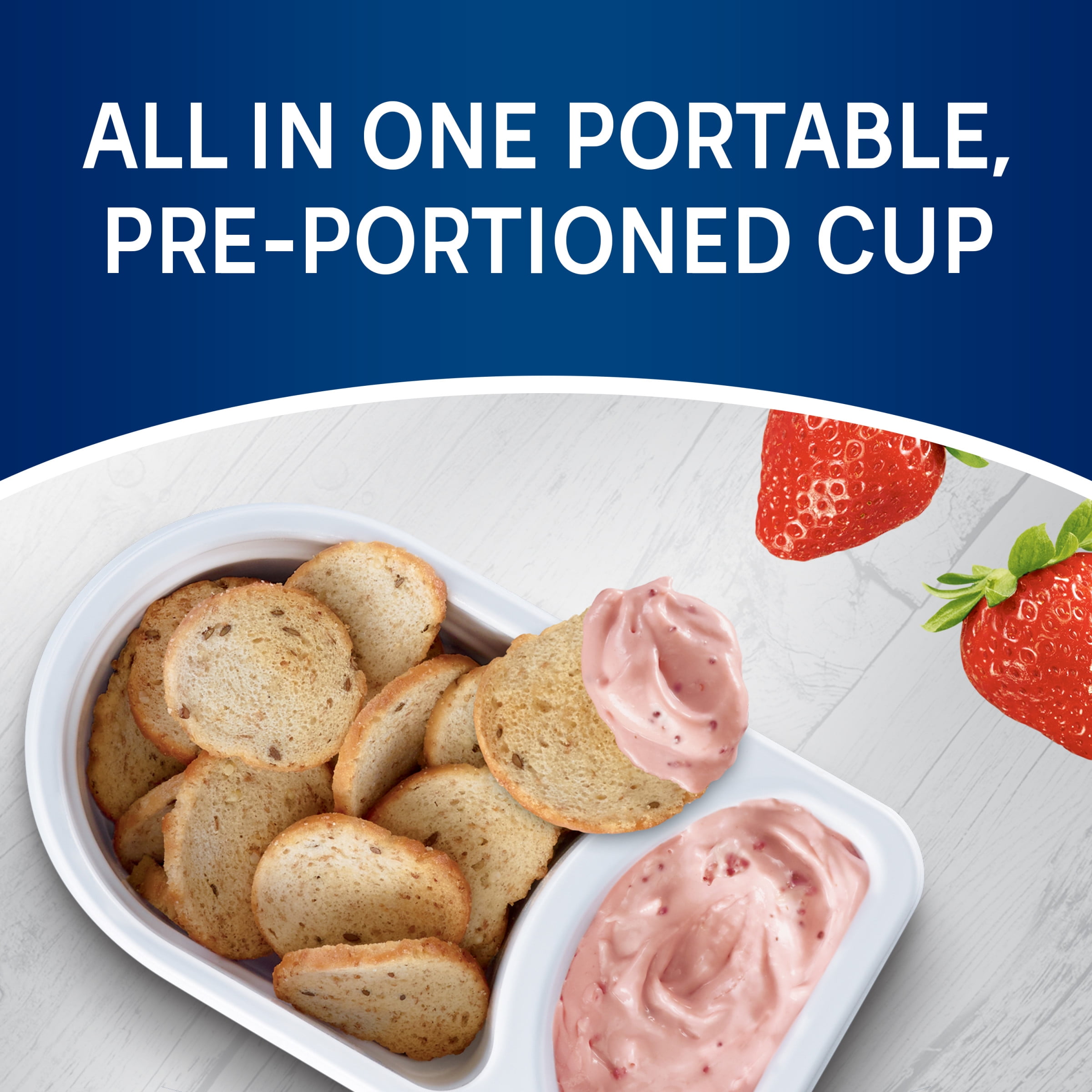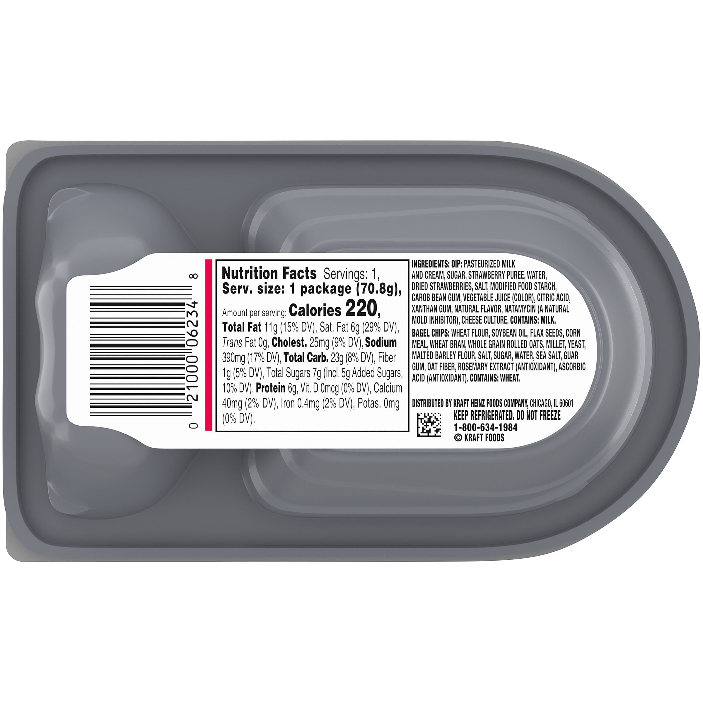 Philadelphia Bagel Chips and Strawberry Cream Cheese Dip is a great way to snack on the go. Enjoy the perfect flavor combination of multigrain bagel chips with a sweet strawberry cream cheese dip. This ready to serve tray makes a delicious snack at home or a quick and easy lunch at work. Just open the convenient serving tray and you’re ready to eat. This delicious snack is made with real fruit and no artificial flavors. This 2.5 ounce bagel chip and cream cheese dip snack comes packaged in a sectioned tray to keep the ingredients separate, and it comes sealed so you can bring this individual snack on the go.