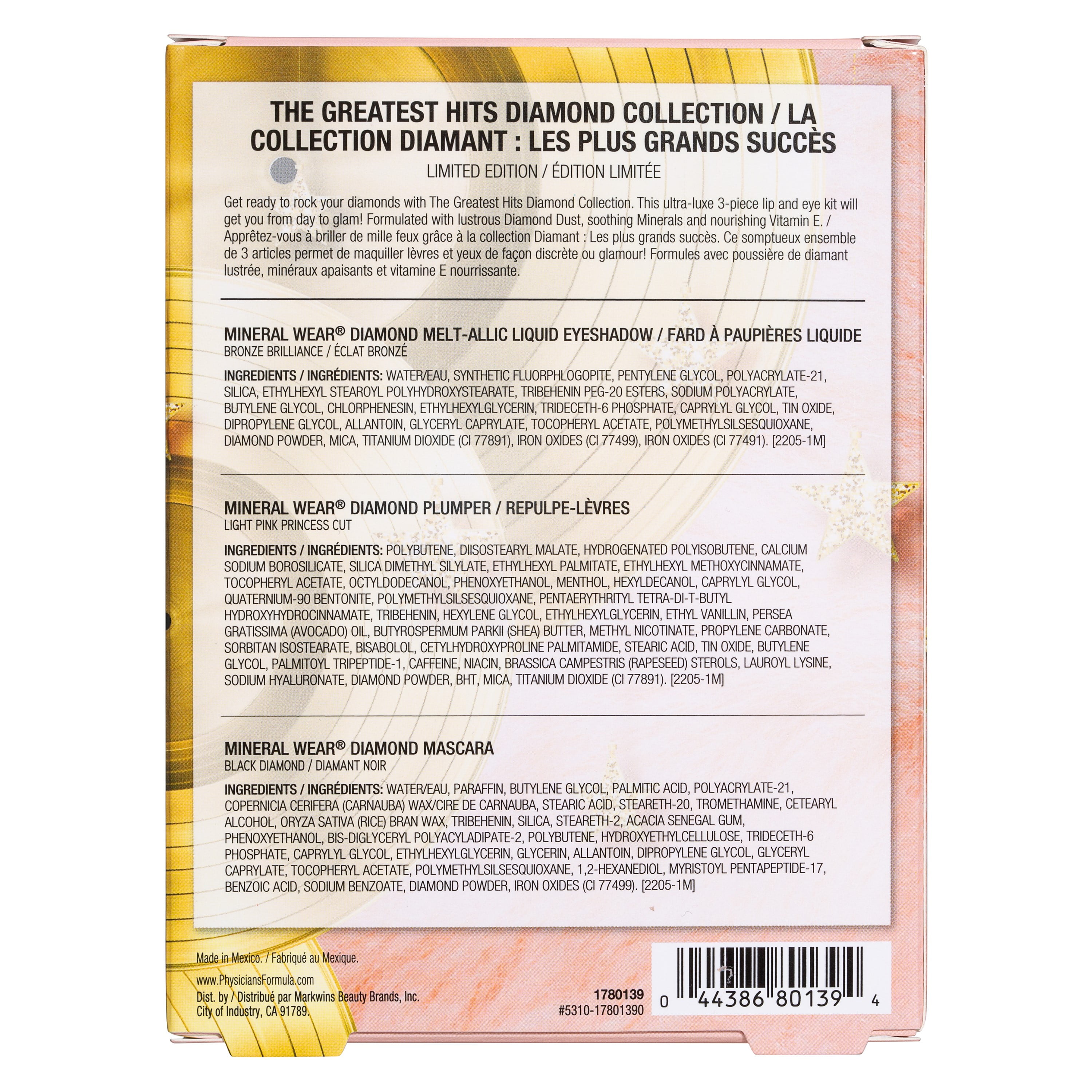 • Get ready to rock your diamonds with The Greatest Hits Diamond Collection. This ultra-luxe 3-piece lip and eye kit will get you from day to glam! Features and Mineral Wear® Diamond Melt-allic Liquid Eyeshadow in ‘Bronze Brilliance’, Mineral Wear® Diamond Plumper in ‘Light Pink Princess Cut’, and Mineral Wear® Diamond Mascara in ‘Black Diamond’. Formulated with lustrous Diamond Dust, soothing Minerals and nourishing Vitamin E.