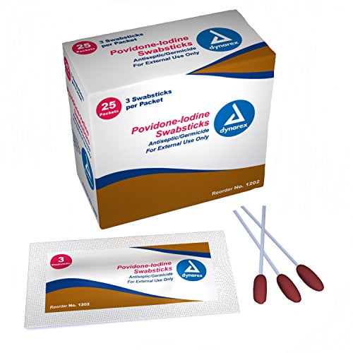 Single use swabs that help prevent cross contamination.25 Pack of 3′ (75 in total)Impregnated Swabstick.10% Strength Povidone Iodine .NonSterile